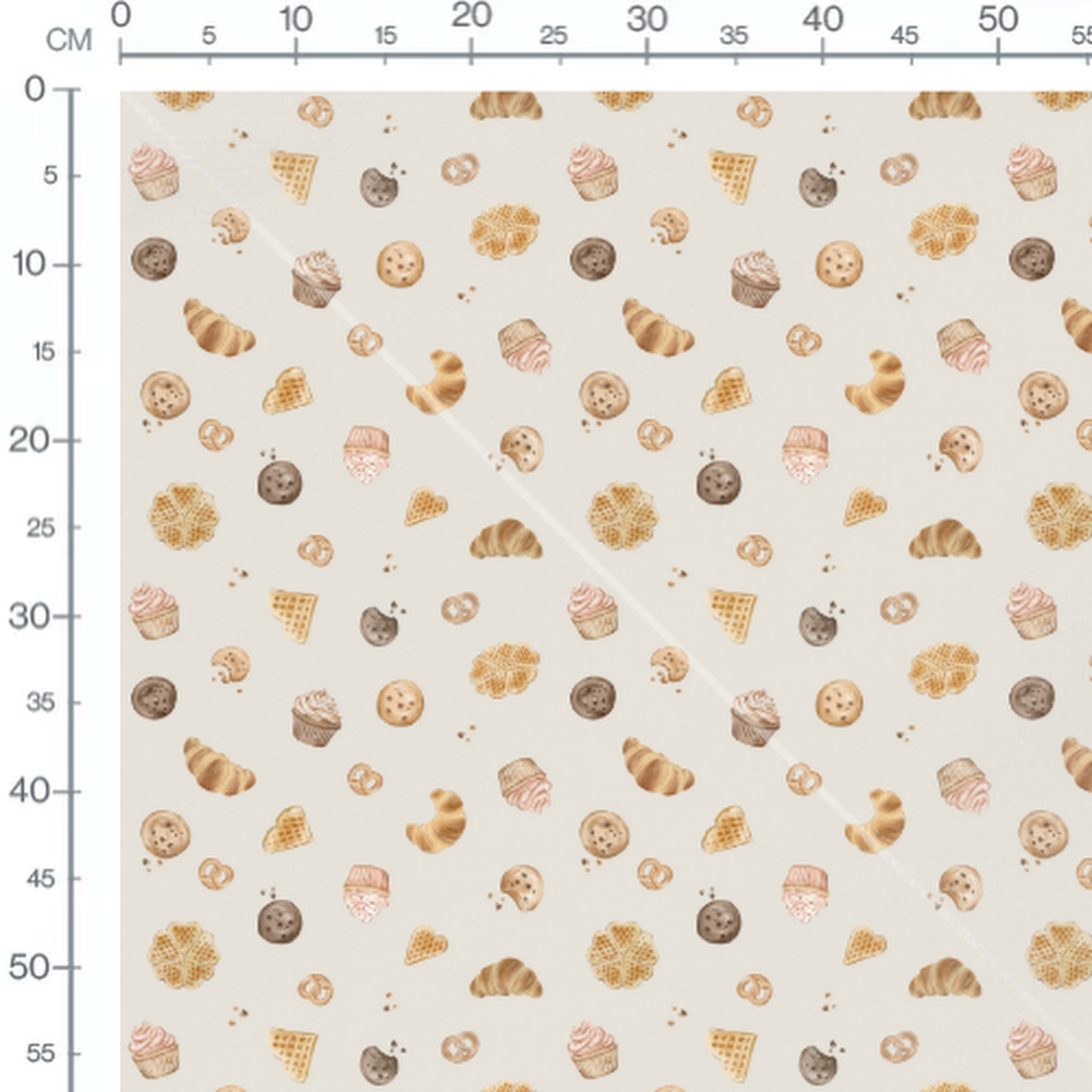 Les croissants sont dorés et les cupcakes ont un glaçage rose ou blanc. Les biscuits sont ronds avec des pépites de chocolat. Les gaufres sont en forme de cœur et de carré, et les bretzels sont entrelacés.Les tissus