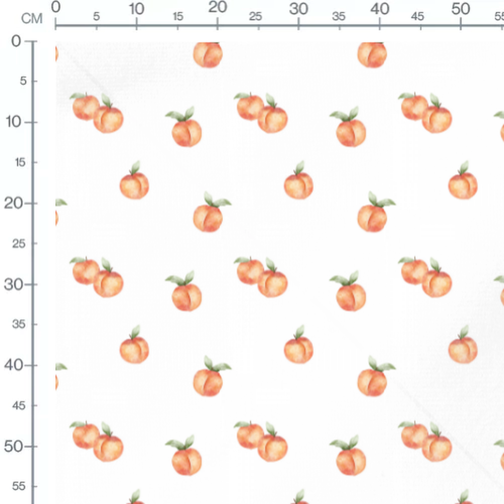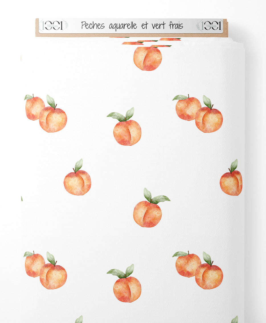 Les pêches sont représentées avec des nuances d'orange et de rouge. Les feuilles vertes ajoutent une touche de fraîcheur au motif.Les tissus
