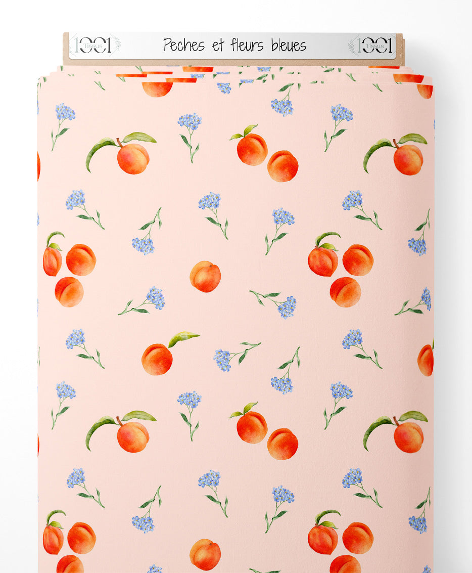 Les pêches sont accompagnées de feuilles vertes. Les fleurs bleues ajoutent une touche délicate au motif.Les tissus