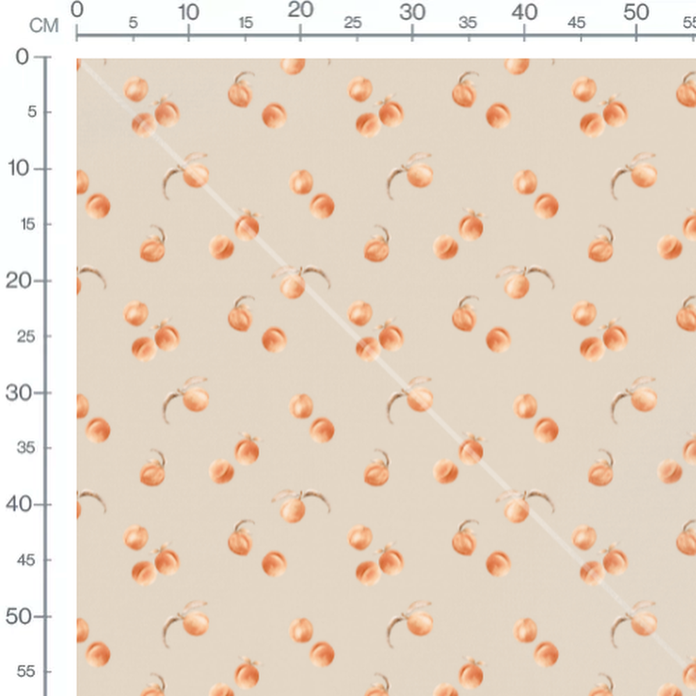 Les pêches sont de couleur orange douce avec des nuances aquarelles. Les feuilles sont légèrement courbées et ajoutent une touche naturelle. Le fond beige met en valeur les couleurs des fruits.Les tissus