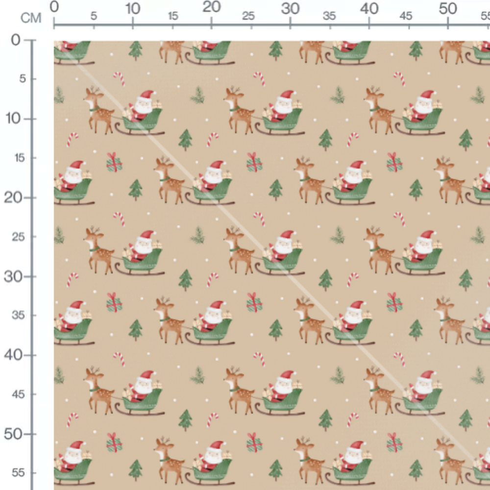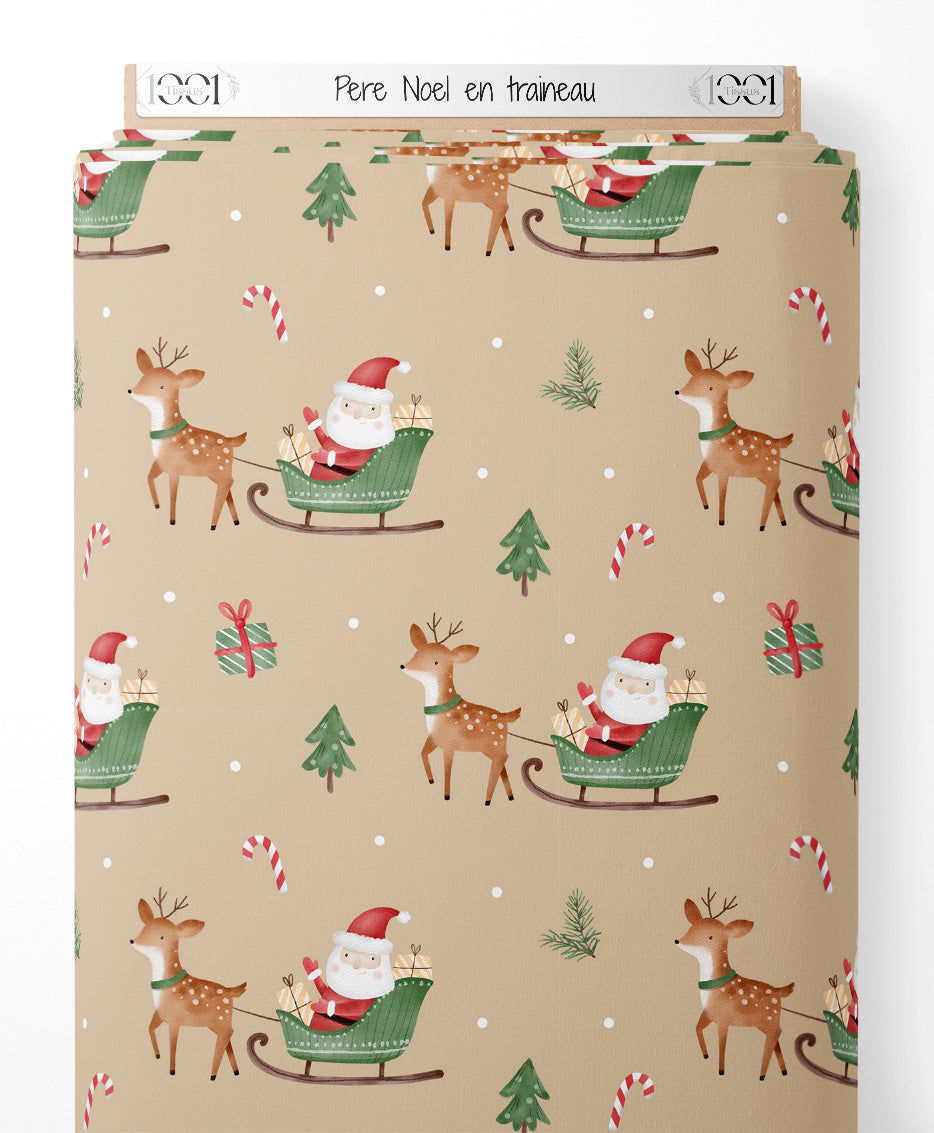 Le motif montre le Père Noël dans un traîneau vert accompagné de rennes bruns. Des cadeaux colorés et des cannes à sucre rouges et blanches sont dispersés. Des arbres verts et des flocons blancs complètent le décor festif.Les tissus