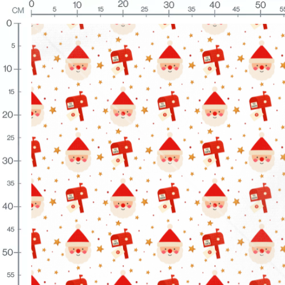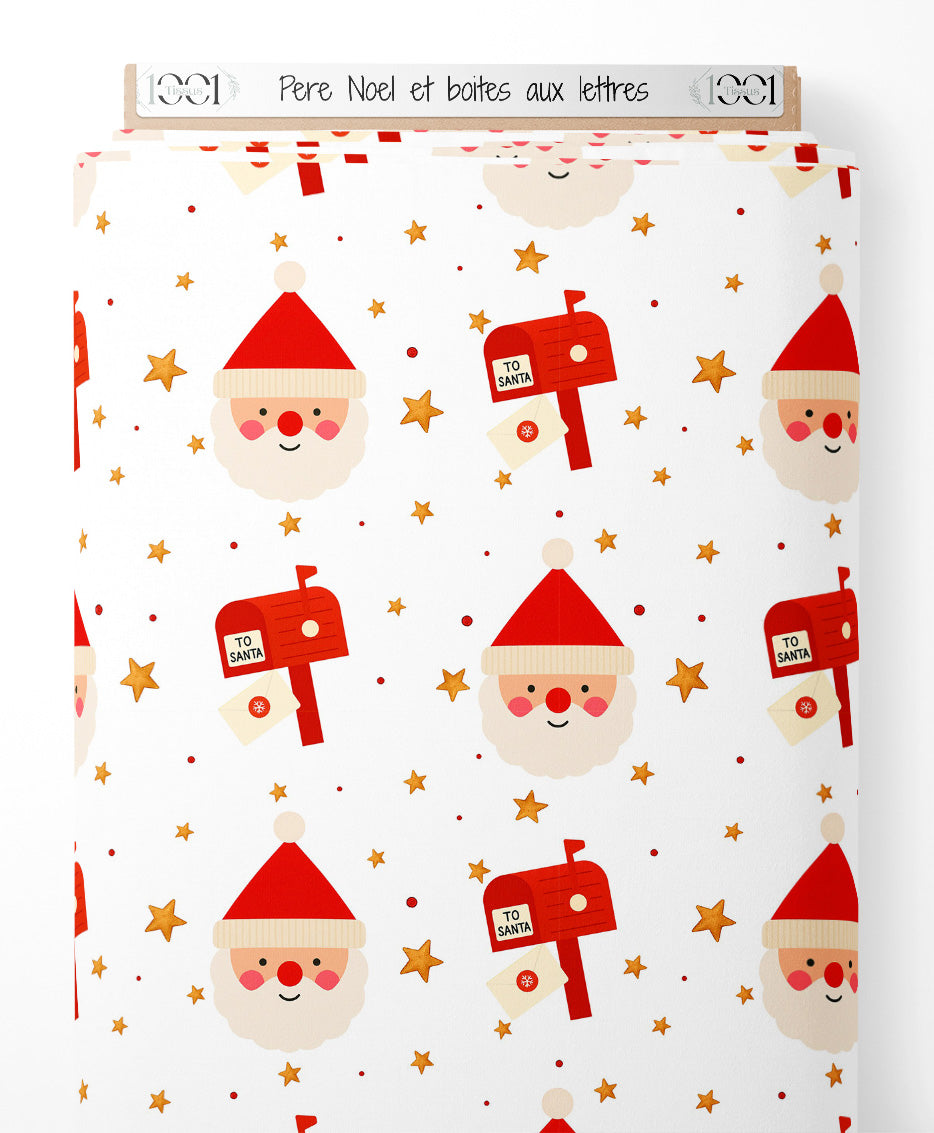 Les visages de Père Noël sont accompagnés de boîtes aux lettres rouges marquées 'To Santa'. Des étoiles dorées et des petites lettres blanches ajoutent des détails festifs. Le fond blanc met en valeur les éléments colorés du motif.Les tissus