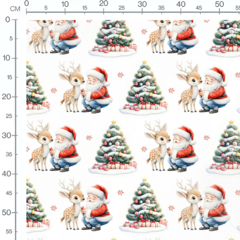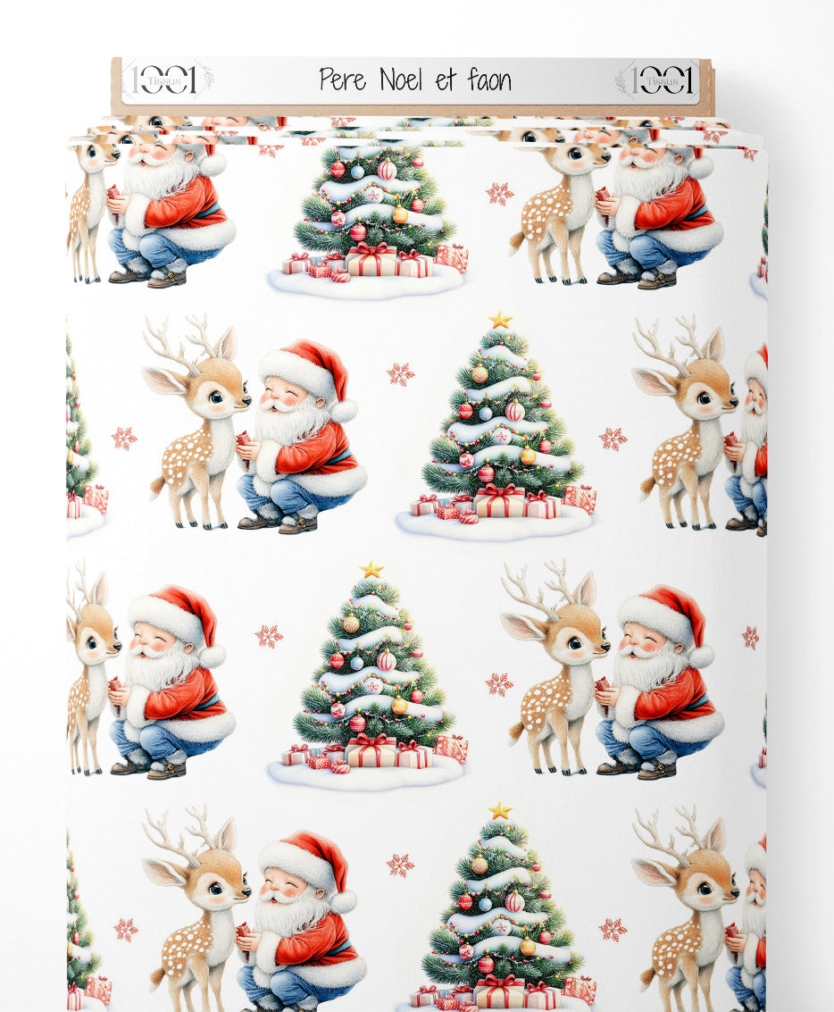 Le Père Noël porte un costume rouge et est accompagné d'un faon brun. Les sapins sont ornés de boules et d'étoiles dorées. Des cadeaux rouges et blancs sont disposés autour des sapins.Les tissus