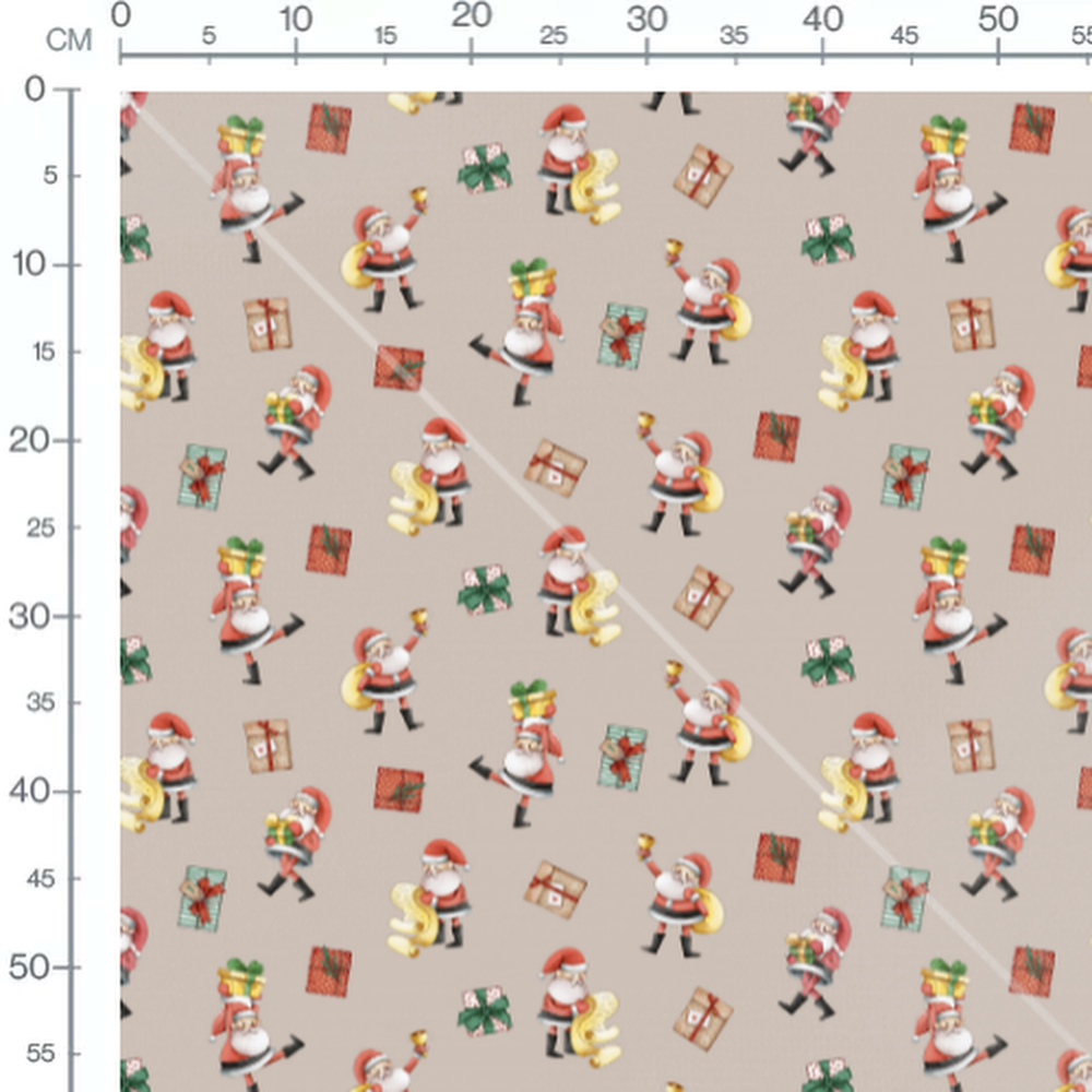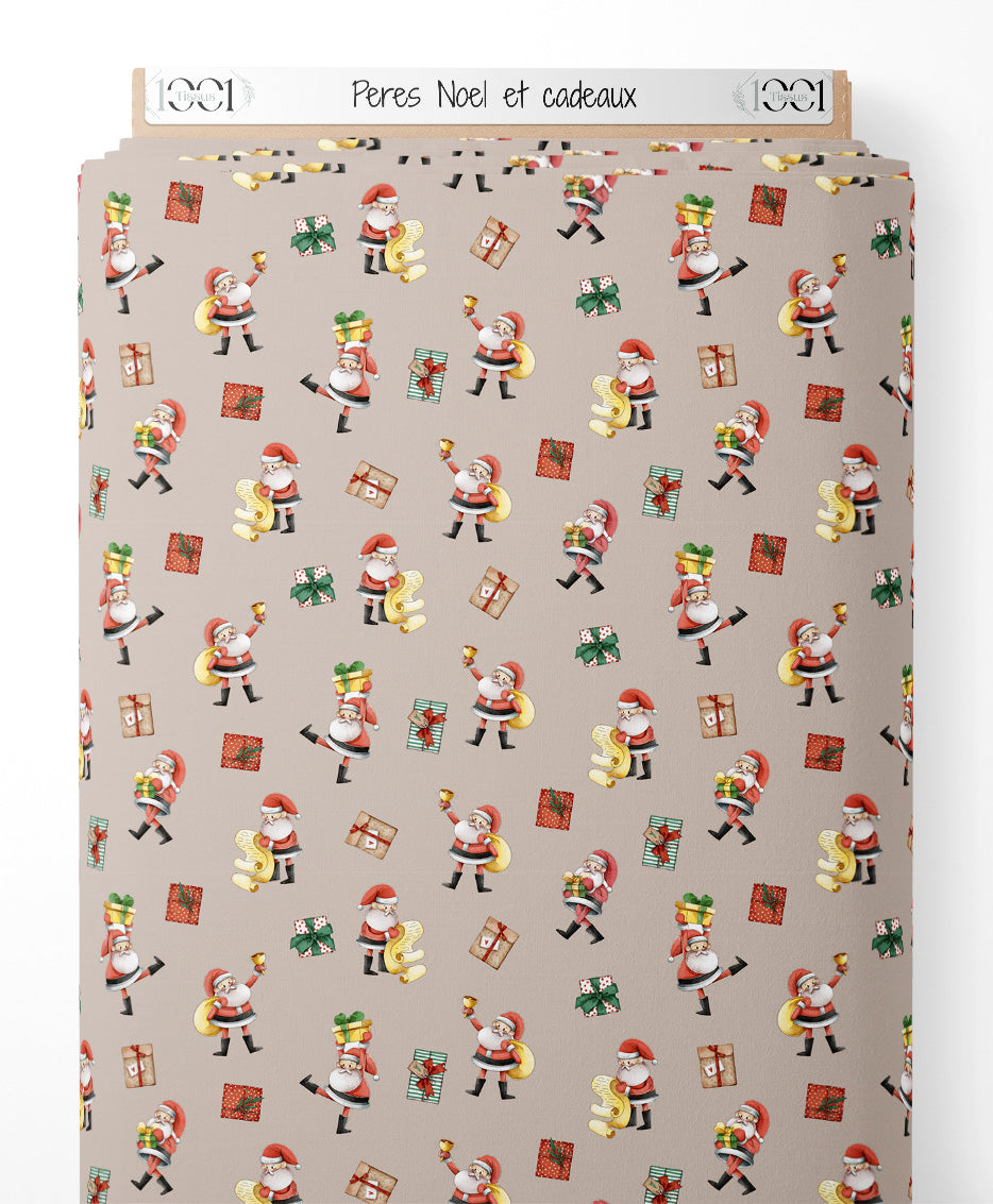 Les Pères Noël portent des costumes rouges et tiennent des cloches dorées. Les cadeaux sont décorés de motifs festifs et de rubans colorés.Les tissus