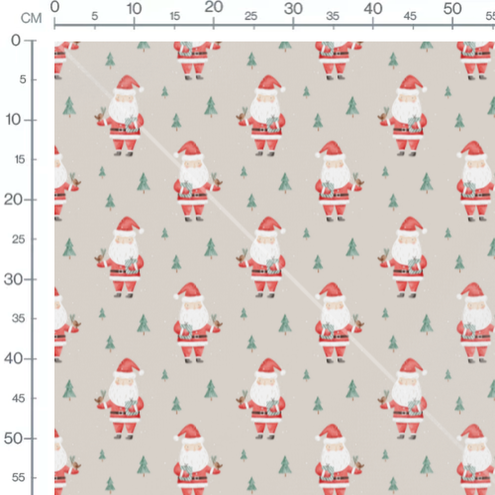 Les Pères Noël portent des costumes rouges et tiennent des cadeaux. De petits sapins verts et des oiseaux bruns complètent le motif.Les tissus