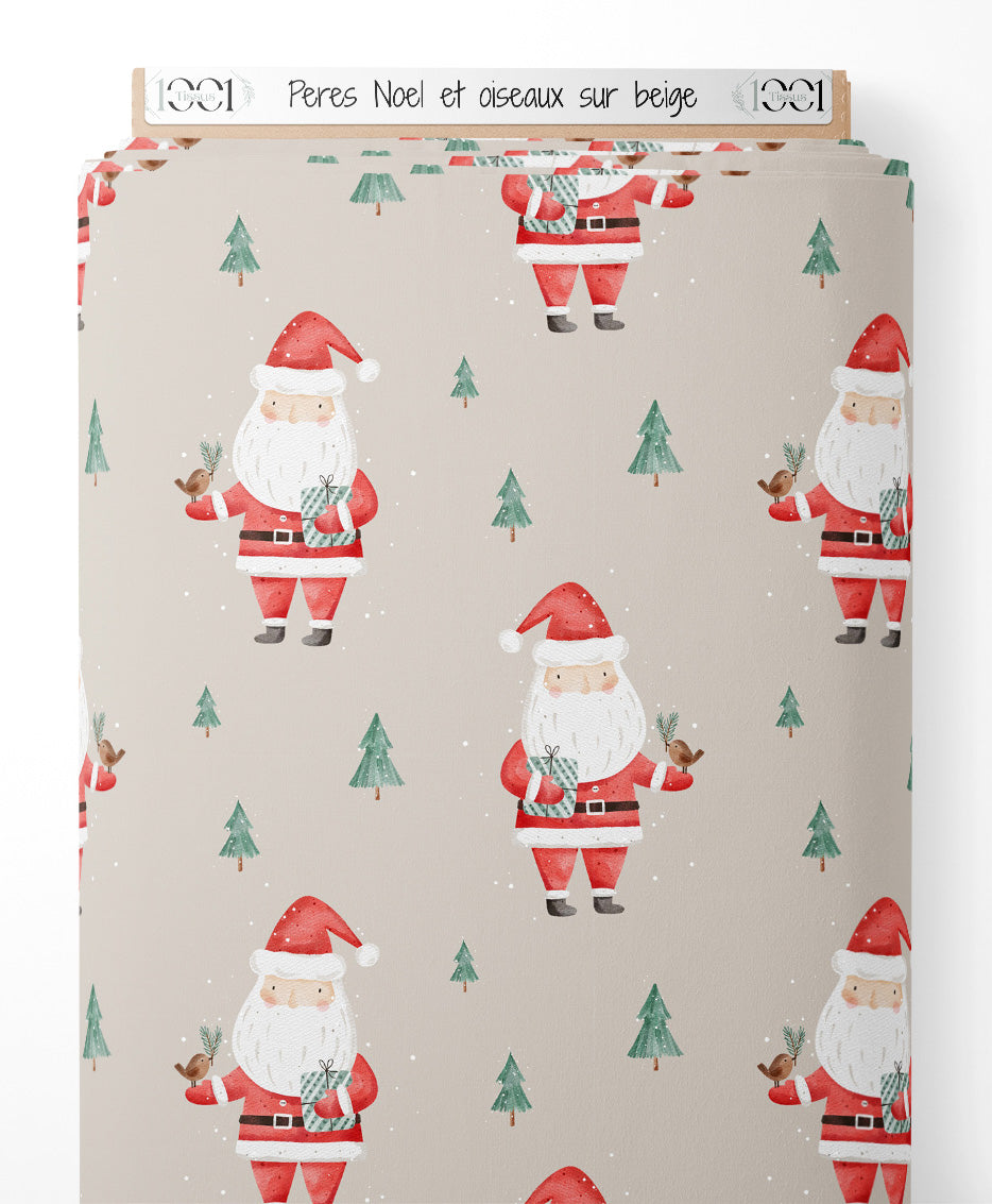 Tissu - Pères Noël et oiseaux sur beige