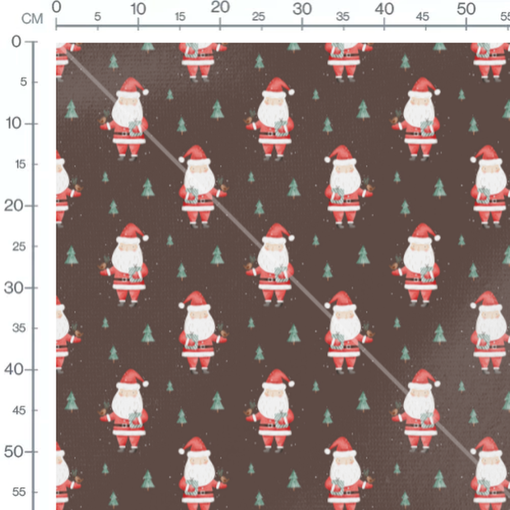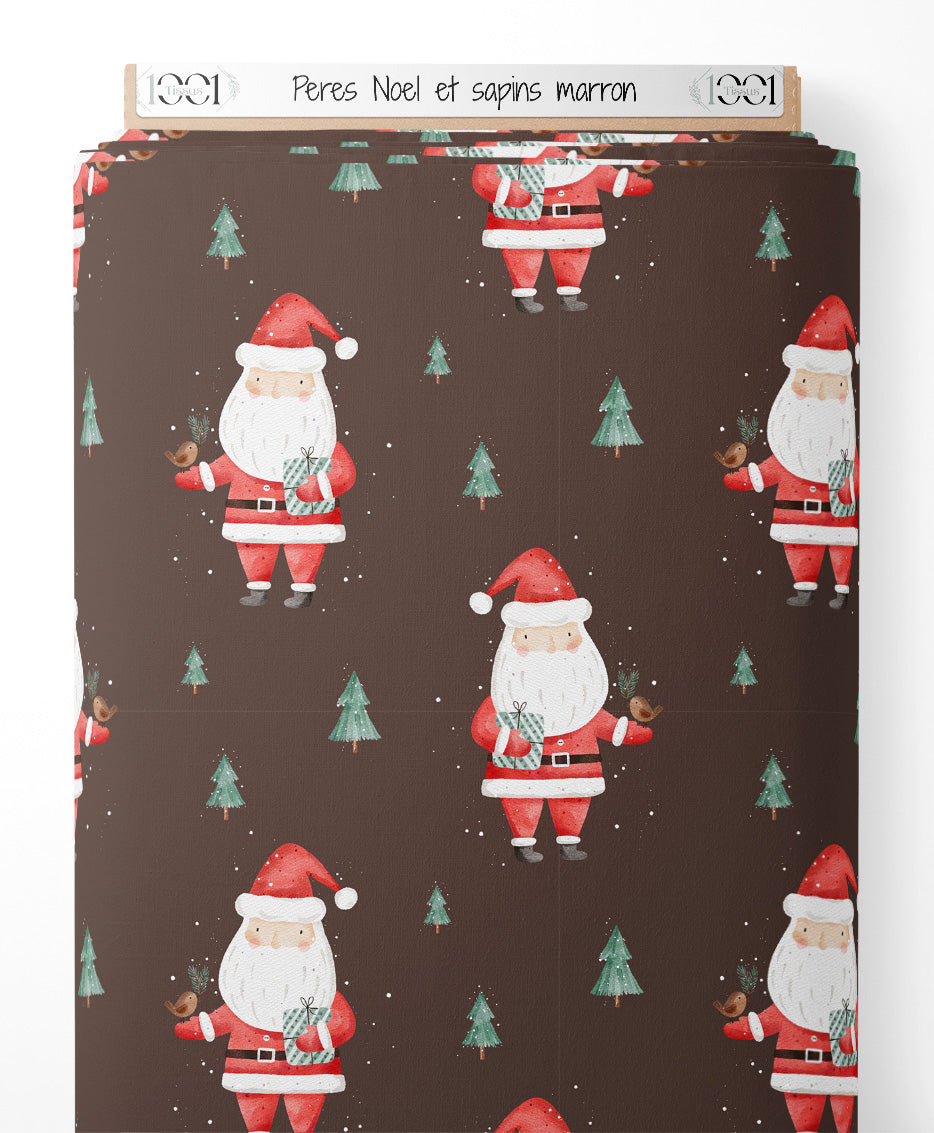 Les Pères Noël portent des costumes rouges et tiennent des cadeaux. De petits sapins verts sont répartis sur le fond marron. Quelques flocons blancs parsèment le motif.Les tissus