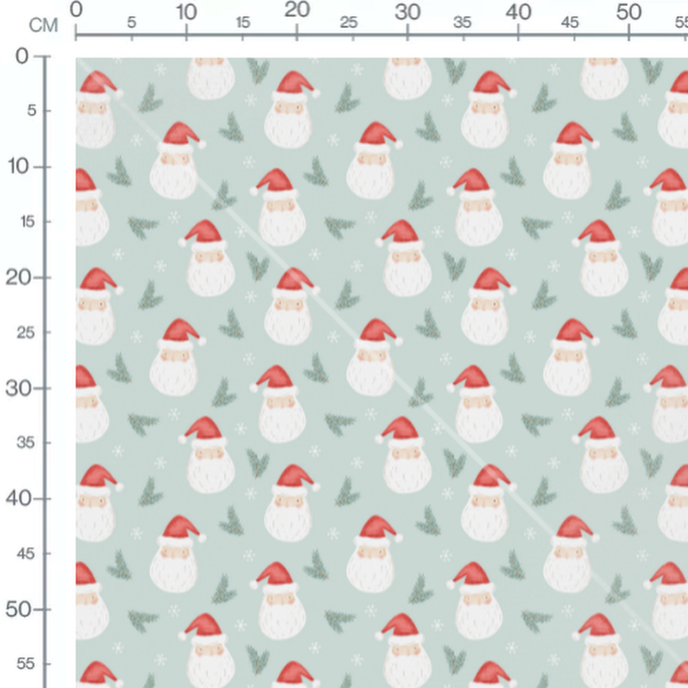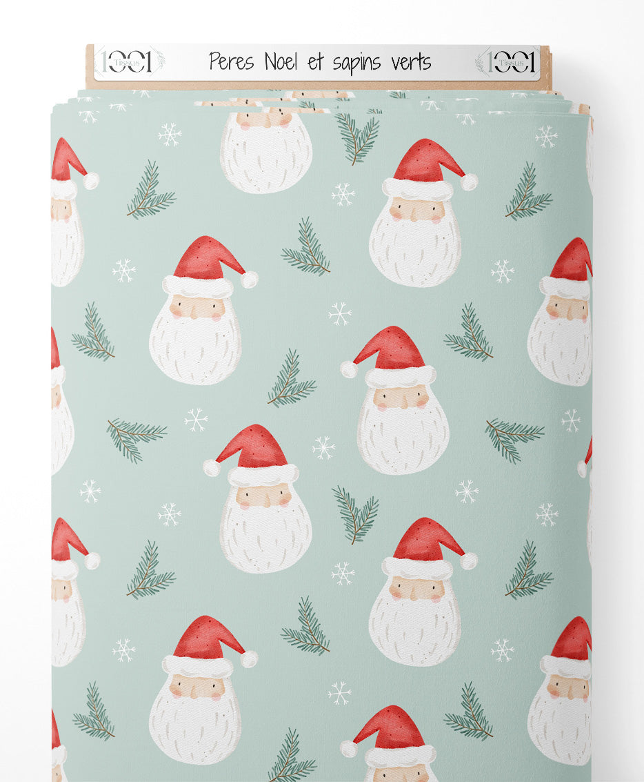 Les visages des Pères Noël sont accompagnés de bonnets rouges distinctifs. Les flocons de neige blancs ajoutent une touche hivernale. Les branches de sapin vertes complètent le thème festif.Les tissus