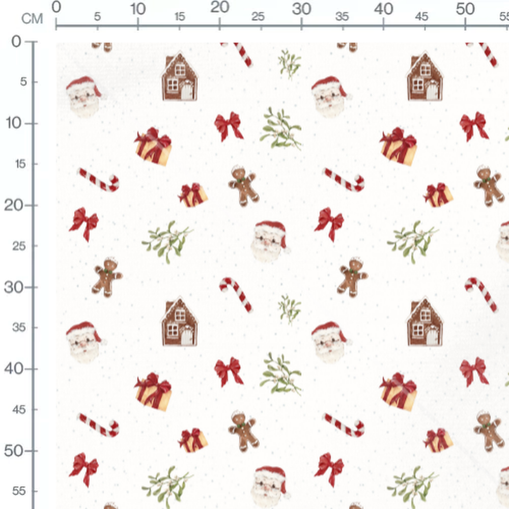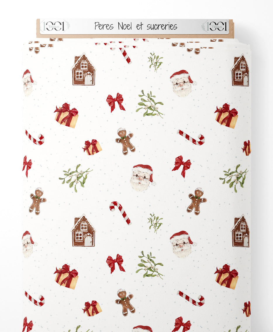 Pères Noël, maisons en pain d'épice, cadeaux, cannes à sucre, bonhommes en pain d'épice, branches de gui et nœuds rouges sur fond blanc. Tissu festif avec des éléments de Noël colorés.Les tissus