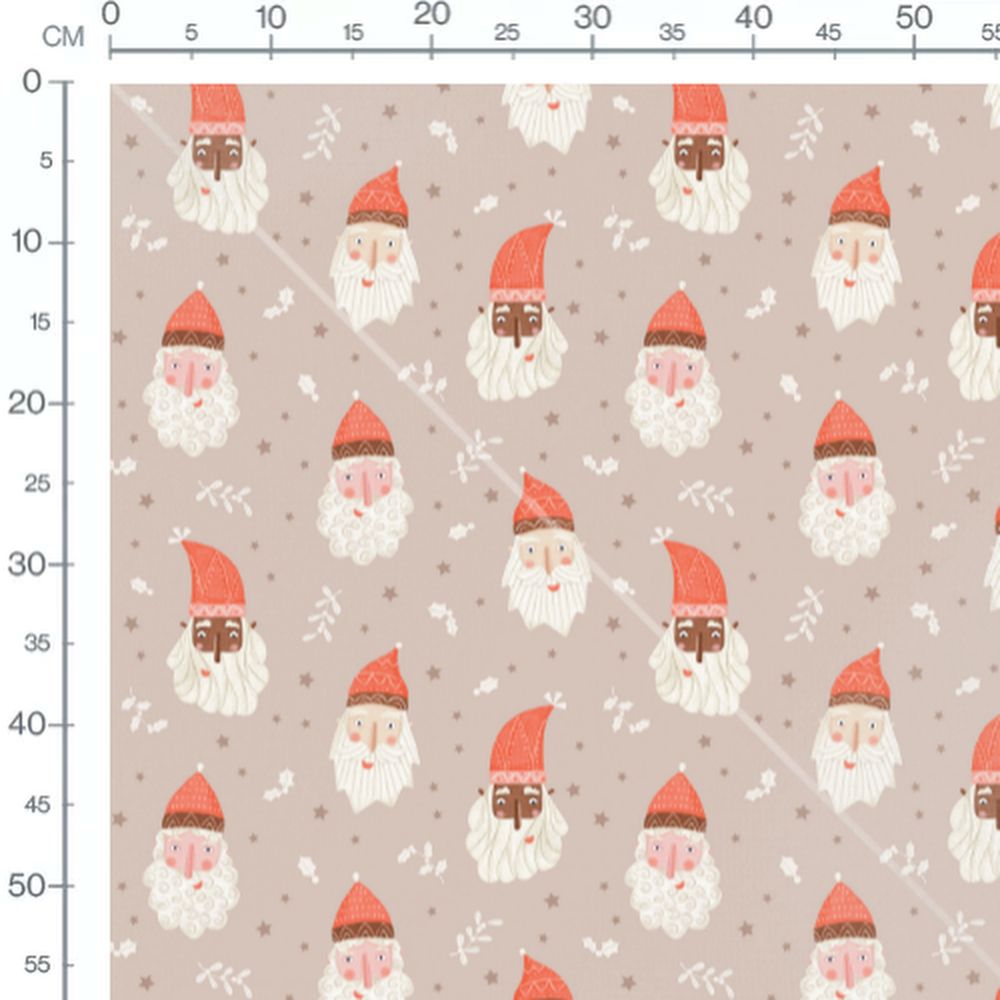 Les visages de Père Noël présentent des expressions variées avec des barbes bouclées et des chapeaux rouges. Des étoiles et des feuilles blanches ajoutent un élément décoratif au fond beige.Les tissus