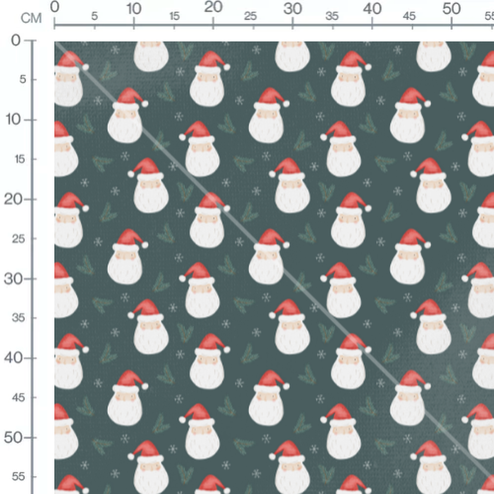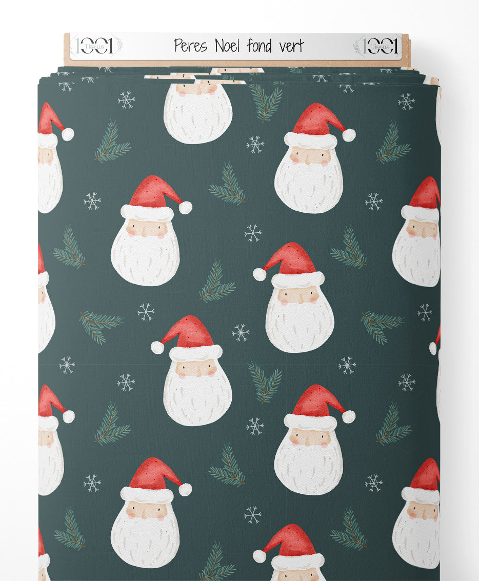 Les visages de Pères Noël sont accompagnés de flocons de neige délicats. Les branches de sapin ajoutent une touche naturelle au motif festif.Les tissus