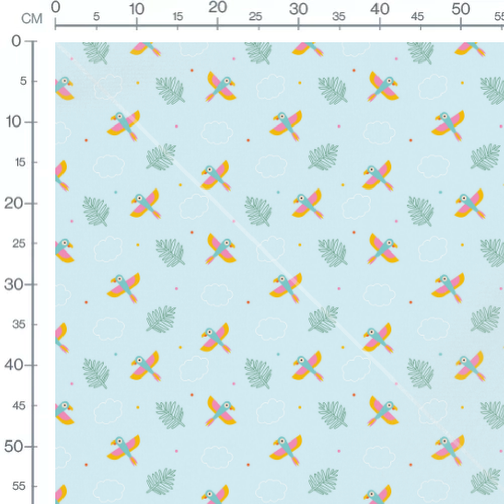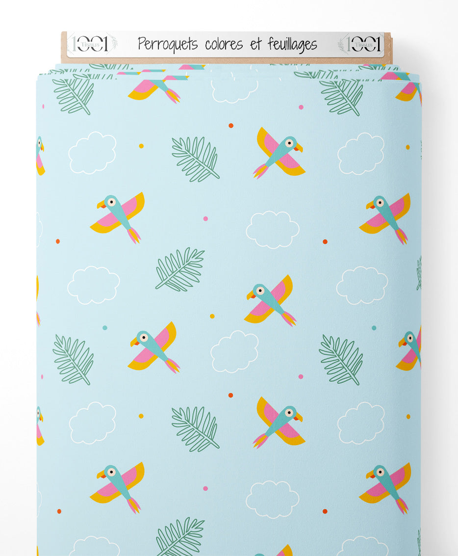 Les perroquets sont illustrés en rose, jaune et bleu. Les feuilles sont dessinées en vert foncé. Des nuages blancs et des points en rose, orange et bleu ajoutent des détails au fond bleu clair.Les tissus