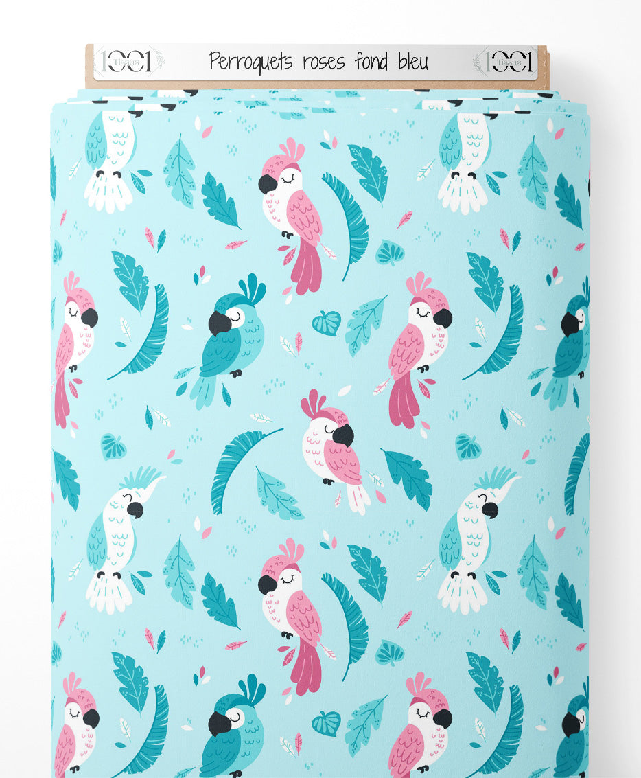 Les perroquets sont dessinés avec des détails simples et des couleurs vives. Les feuilles tropicales ajoutent une touche exotique au motif. De petites plumes roses et bleues complètent le design.Les tissus