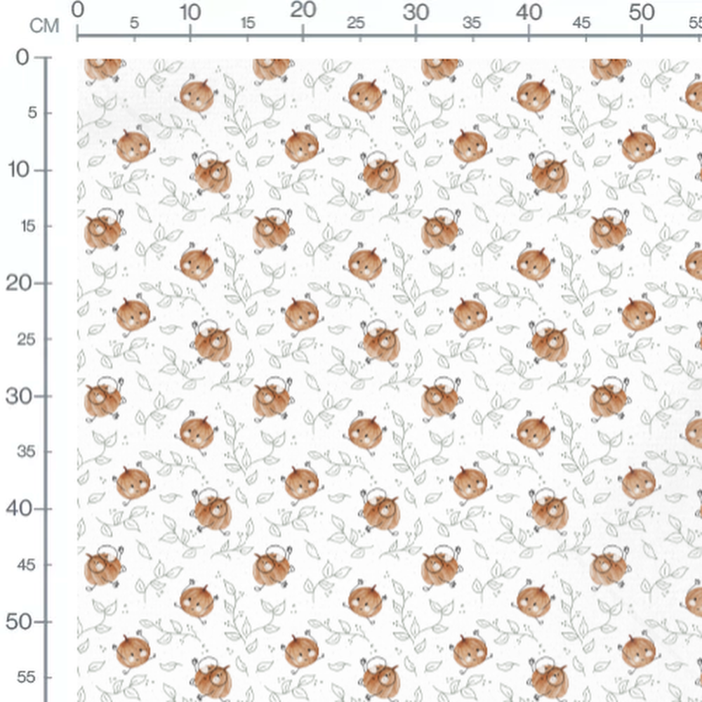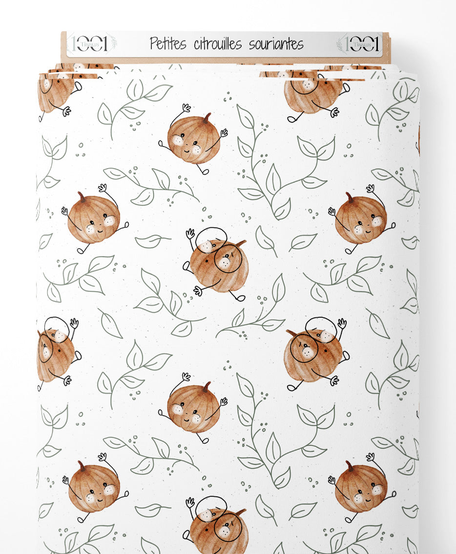 Les citrouilles ont des expressions joyeuses et sont dessinées de manière ludique. Les feuilles grises ajoutent une touche naturelle au motif. De petites taches grises parsèment le fond blanc.Les tissus