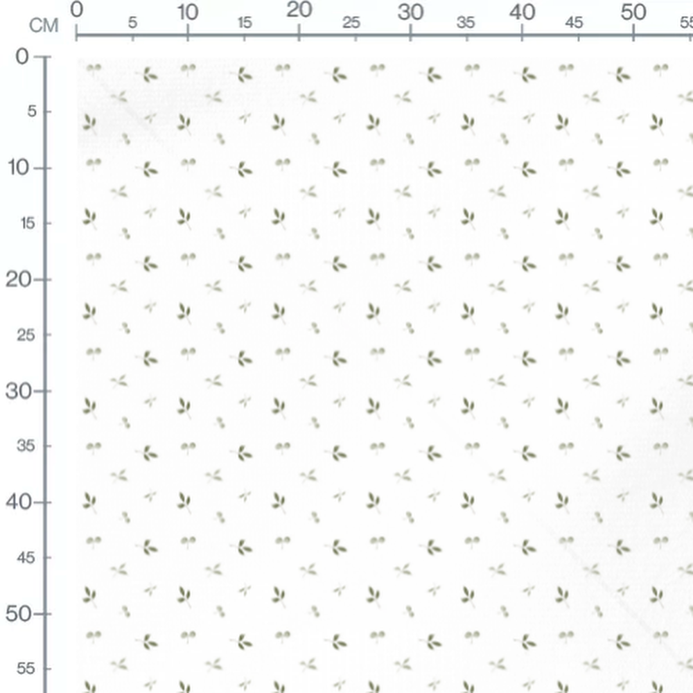 Les feuilles sont de forme simple et de couleur verte. Les baies sont petites et de couleur grise, ajoutant une touche subtile au motif.Les tissus