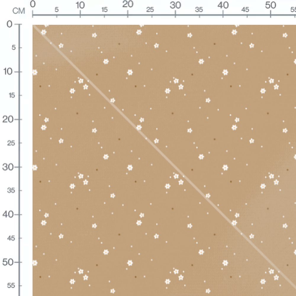 Les fleurs blanches sont de petite taille et réparties uniformément. Les points marron ajoutent un contraste subtil au fond beige.Les tissus