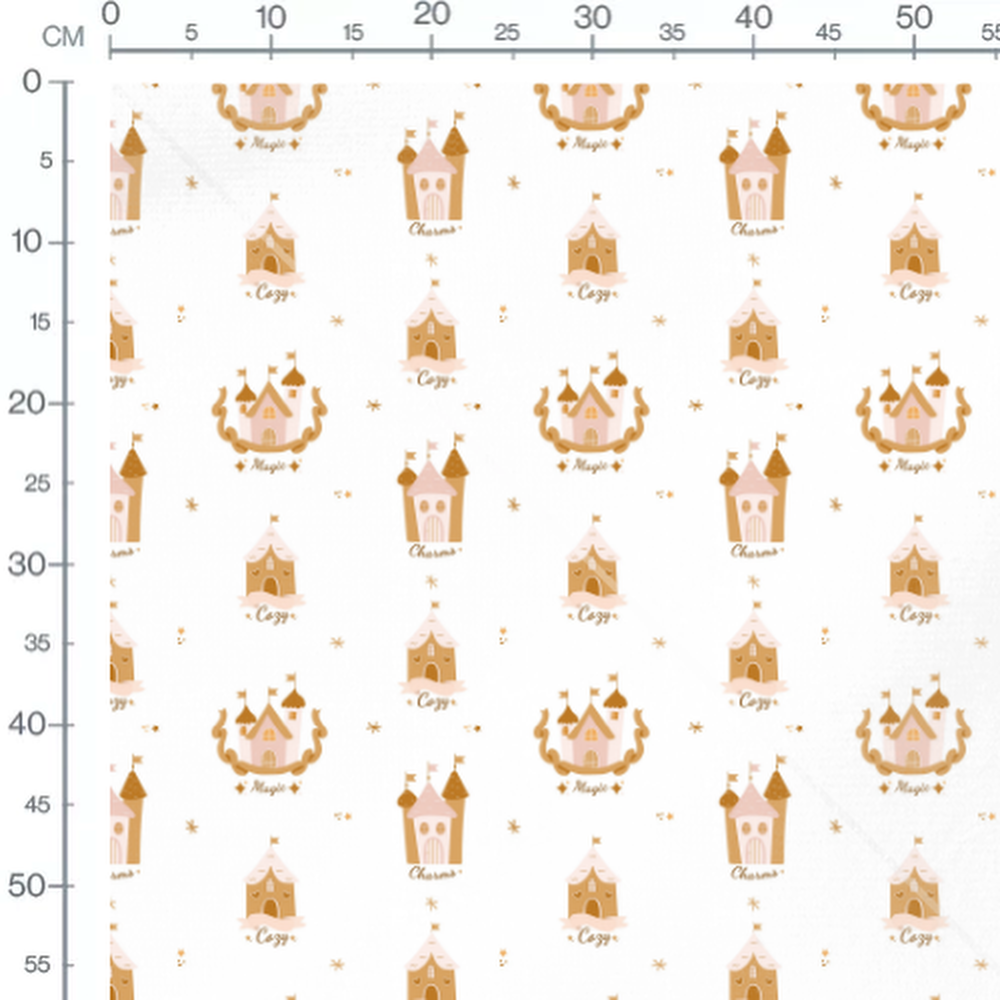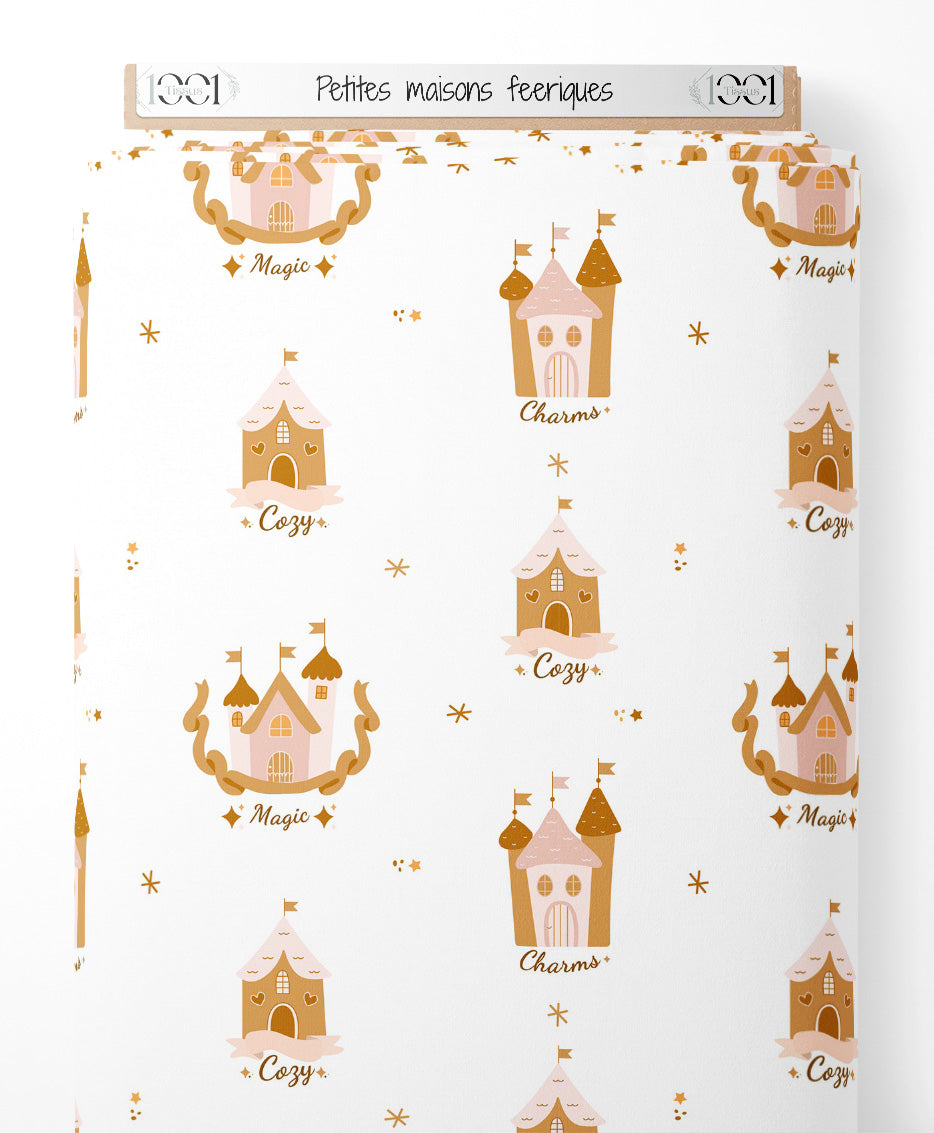 Les maisons ont des toits roses et des murs marron avec des fenêtres en forme de cœur. Des mots comme 'Magic' et 'Cozy' sont écrits à côté des maisons.Les tissus