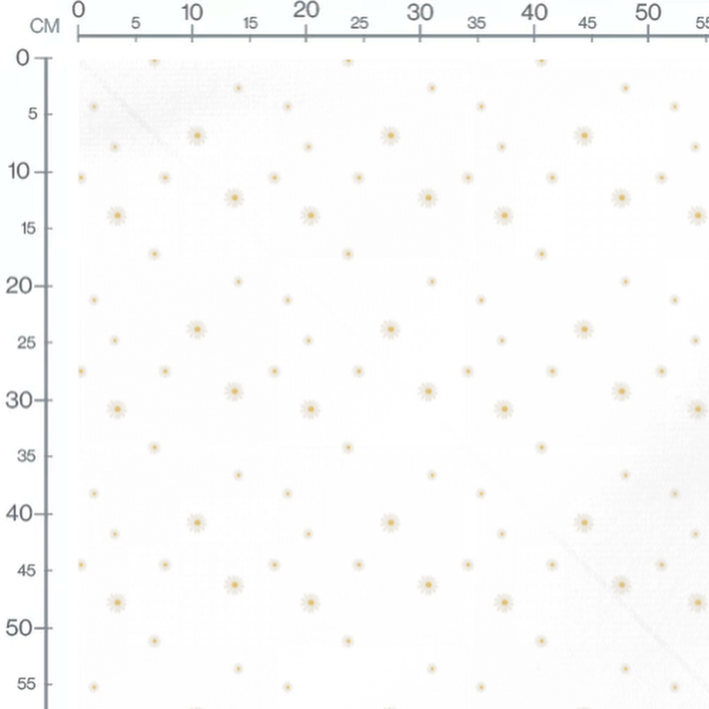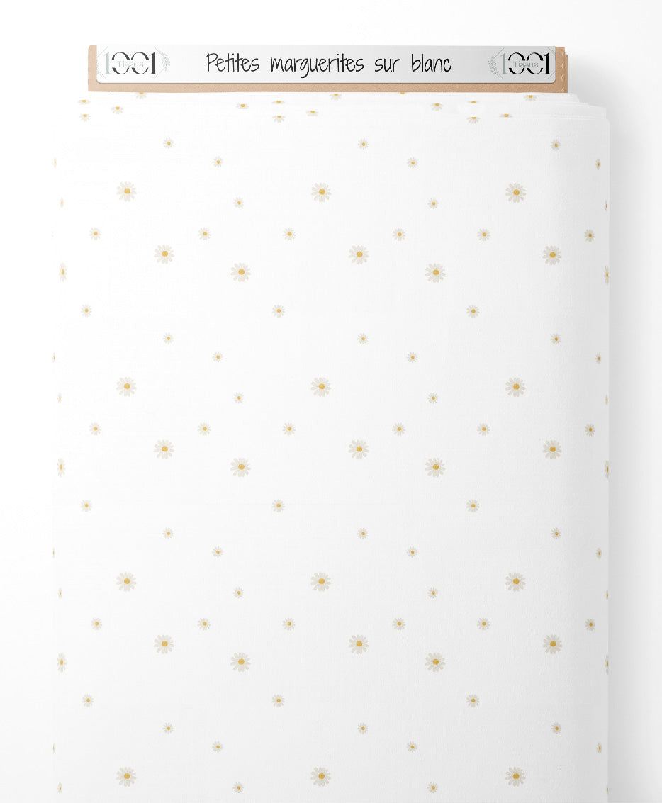 Les marguerites ont des pétales blancs et un centre jaune. Elles sont espacées de manière régulière sur le fond blanc.Les tissus