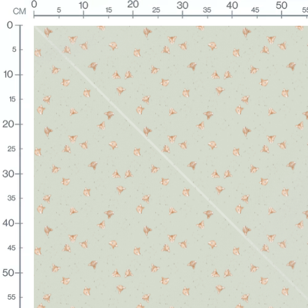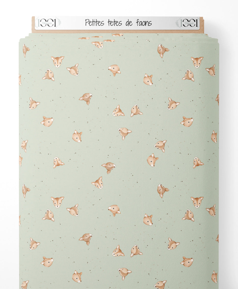 Les faons ont des expressions douces et sont orientés dans différentes directions. Le fond vert clair est parsemé de petites taches grises, ajoutant une texture subtile.Les tissus