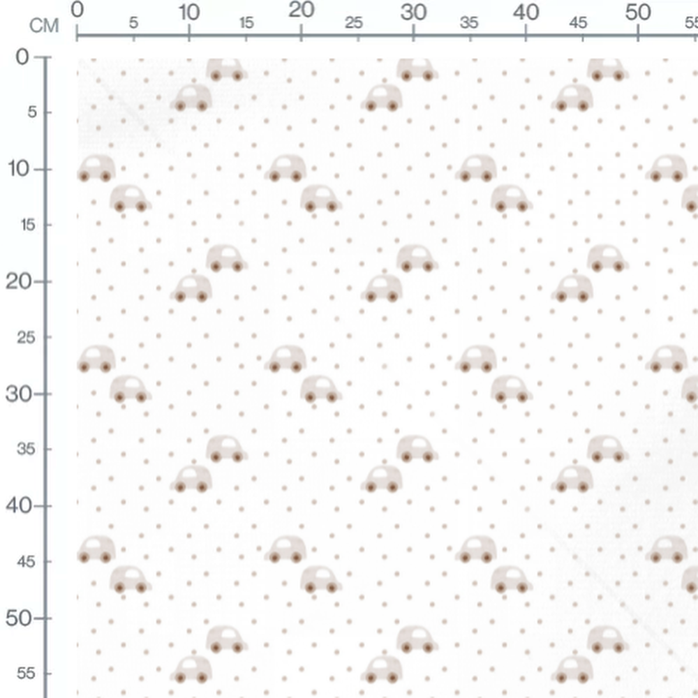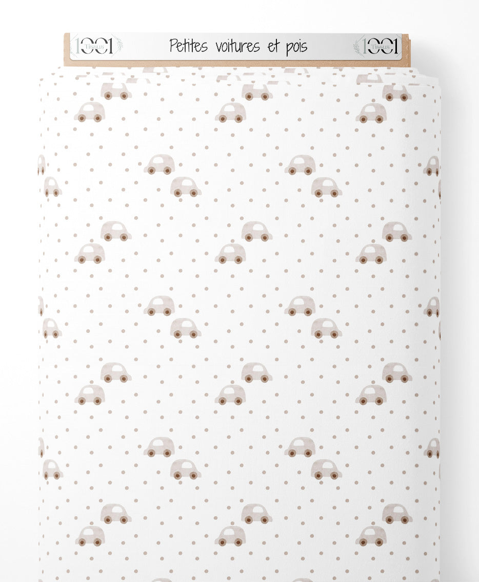 Les voitures sont dessinées de manière simple et enfantine. Les pois ajoutent une touche ludique au motif. Le fond blanc met en valeur les éléments du motif.Les tissus