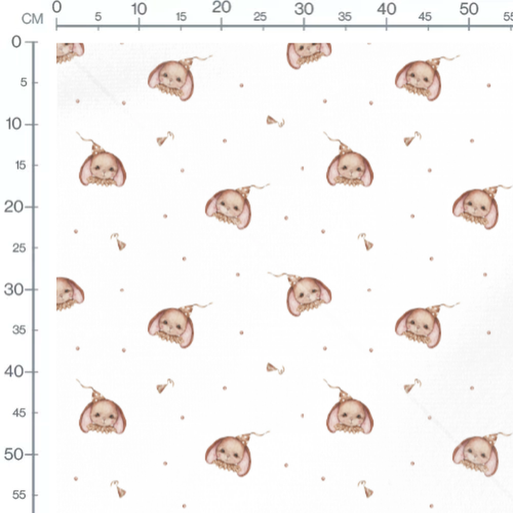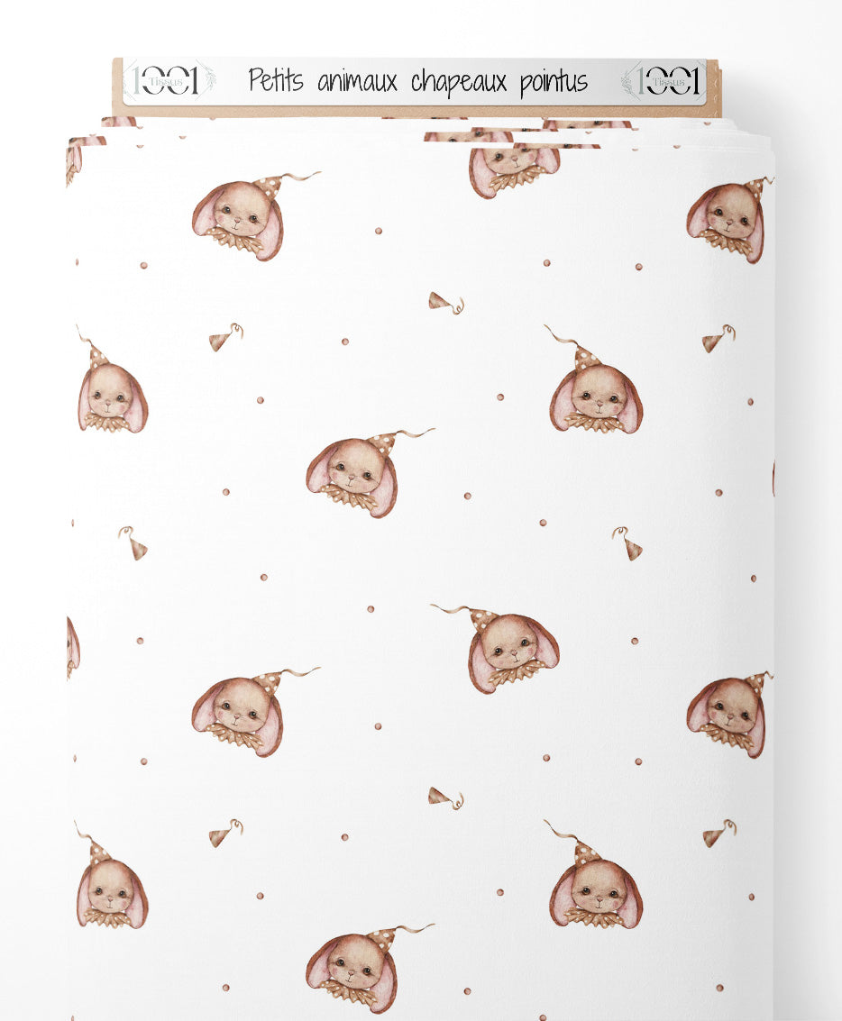 Les animaux portent des chapeaux à pois et ont de grandes oreilles. De petites touches de brun et rose décorent le motif.Les tissus