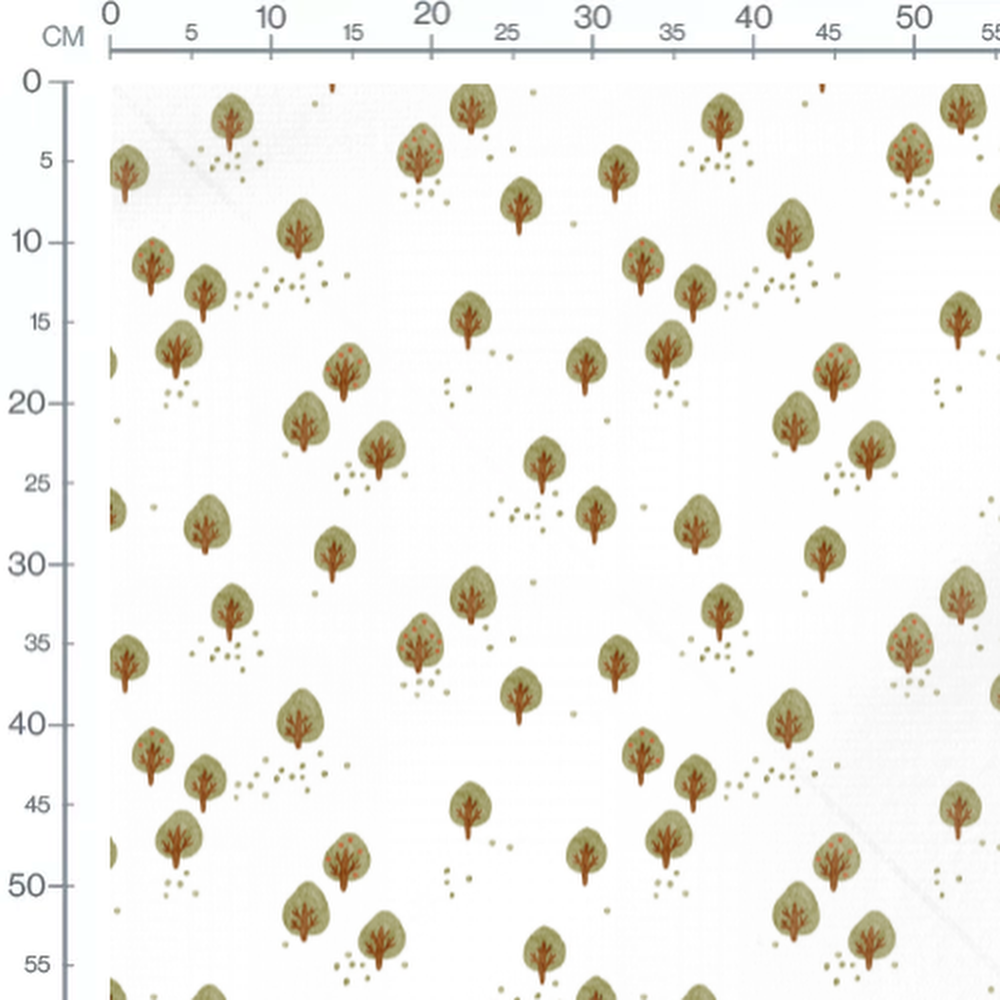 Les arbres ont une forme arrondie avec des troncs bruns distincts. De petits points verts sont éparpillés aléatoirement entre les arbres.Les tissus
