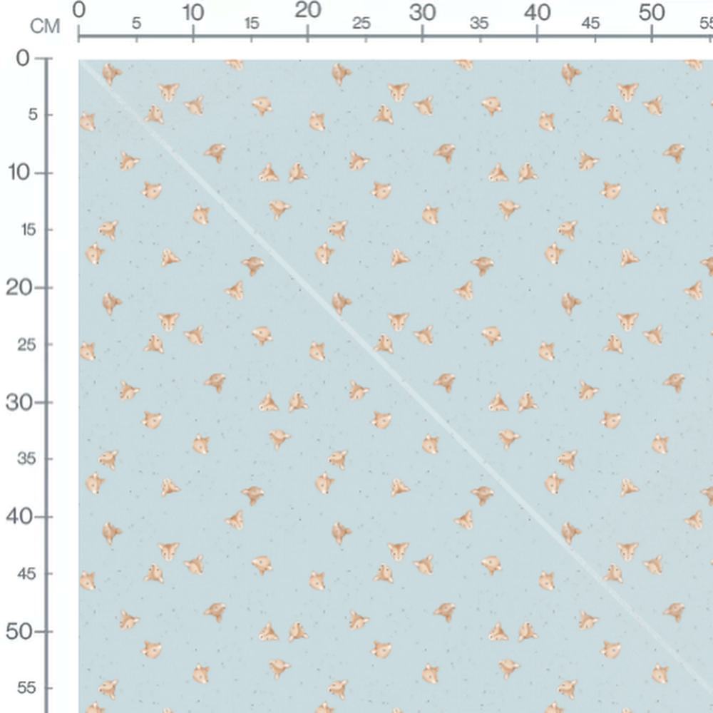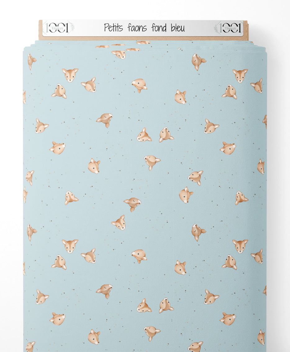 Les faons ont des expressions douces et sont répartis uniformément. Le fond bleu clair ajoute une touche apaisante au motif. Les taches grises ajoutent un léger contraste au design.Les tissus