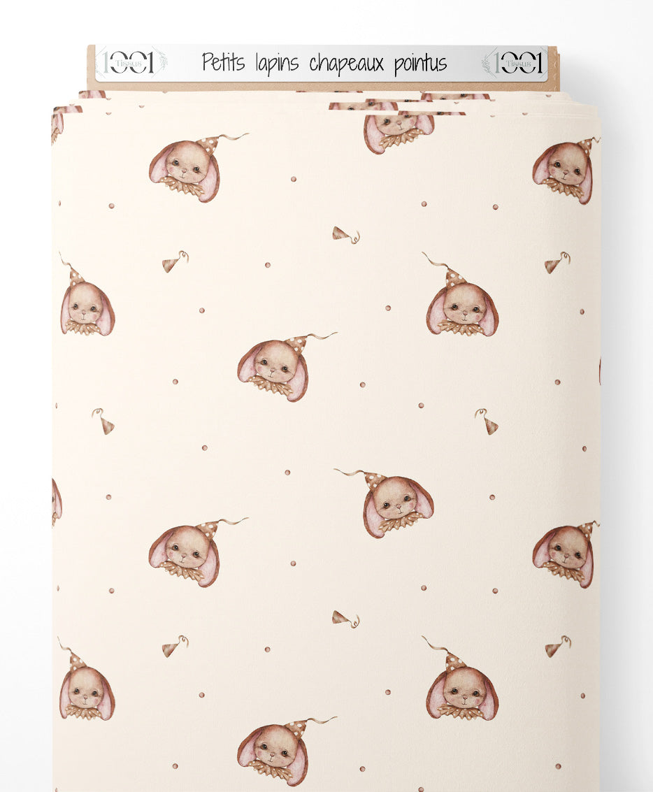 Les lapins portent des chapeaux à pois et ont de grandes oreilles roses. Le fond crème est parsemé de petits points bruns.Les tissus