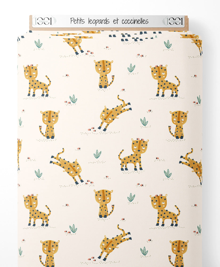 Les léopards sont dessinés de manière ludique avec des expressions amicales. Les coccinelles ajoutent une touche de couleur vive. De petites plantes vertes parsèment le fond crème, créant une ambiance naturelle et douce.Les tissus