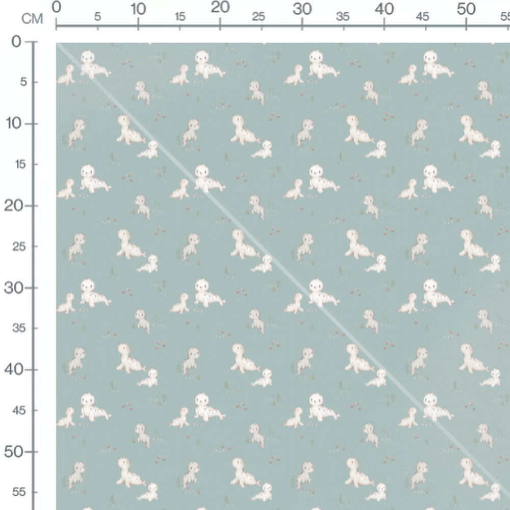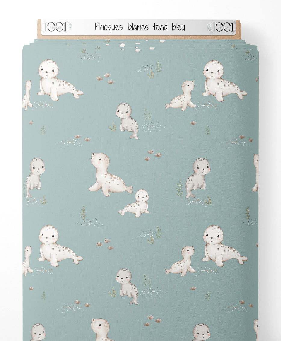 Les phoques sont dessinés avec des expressions adorables et des taches grises distinctes. De petites plantes vertes et des fleurs blanches ajoutent une touche de nature. Le fond bleu doux crée une ambiance apaisante. Quelques petits cailloux bruns sont également présents.Les tissus