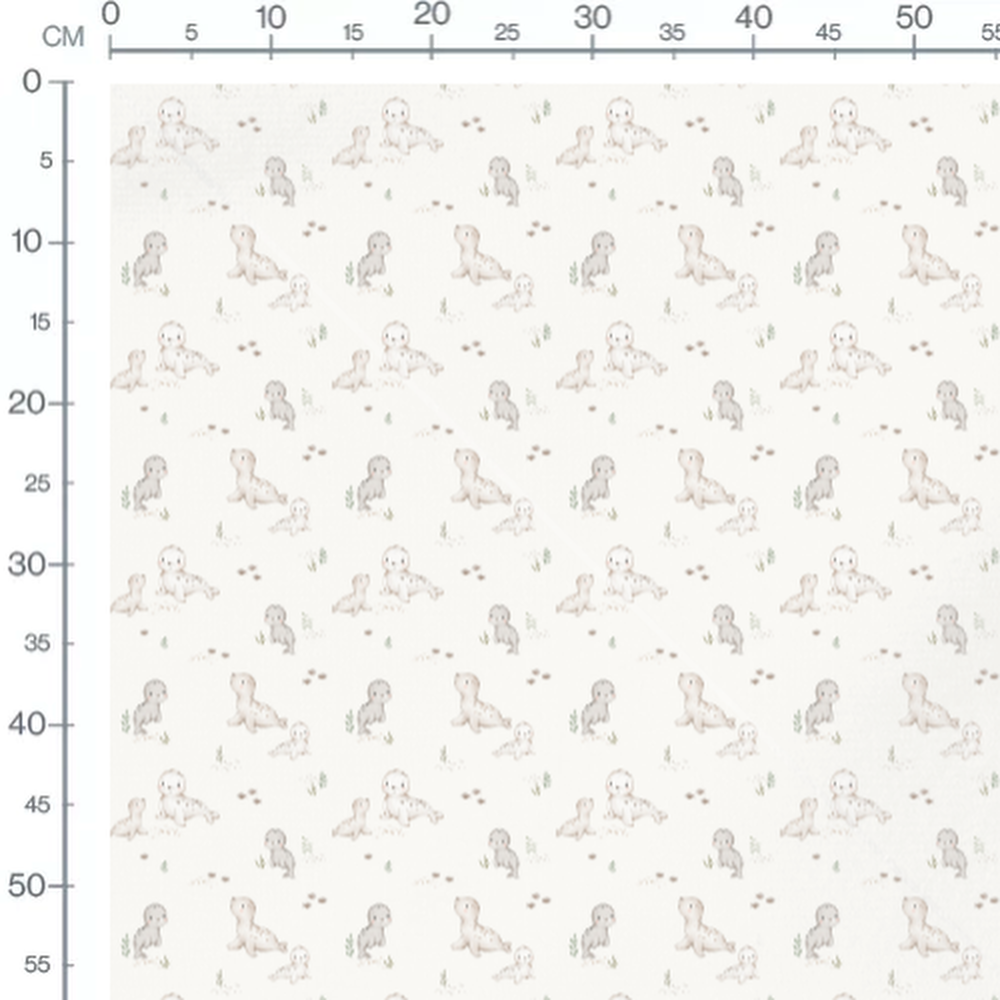 Les phoques sont accompagnés de petits poissons gris. Quelques plantes aquatiques vertes ajoutent des détails au motif.Les tissus