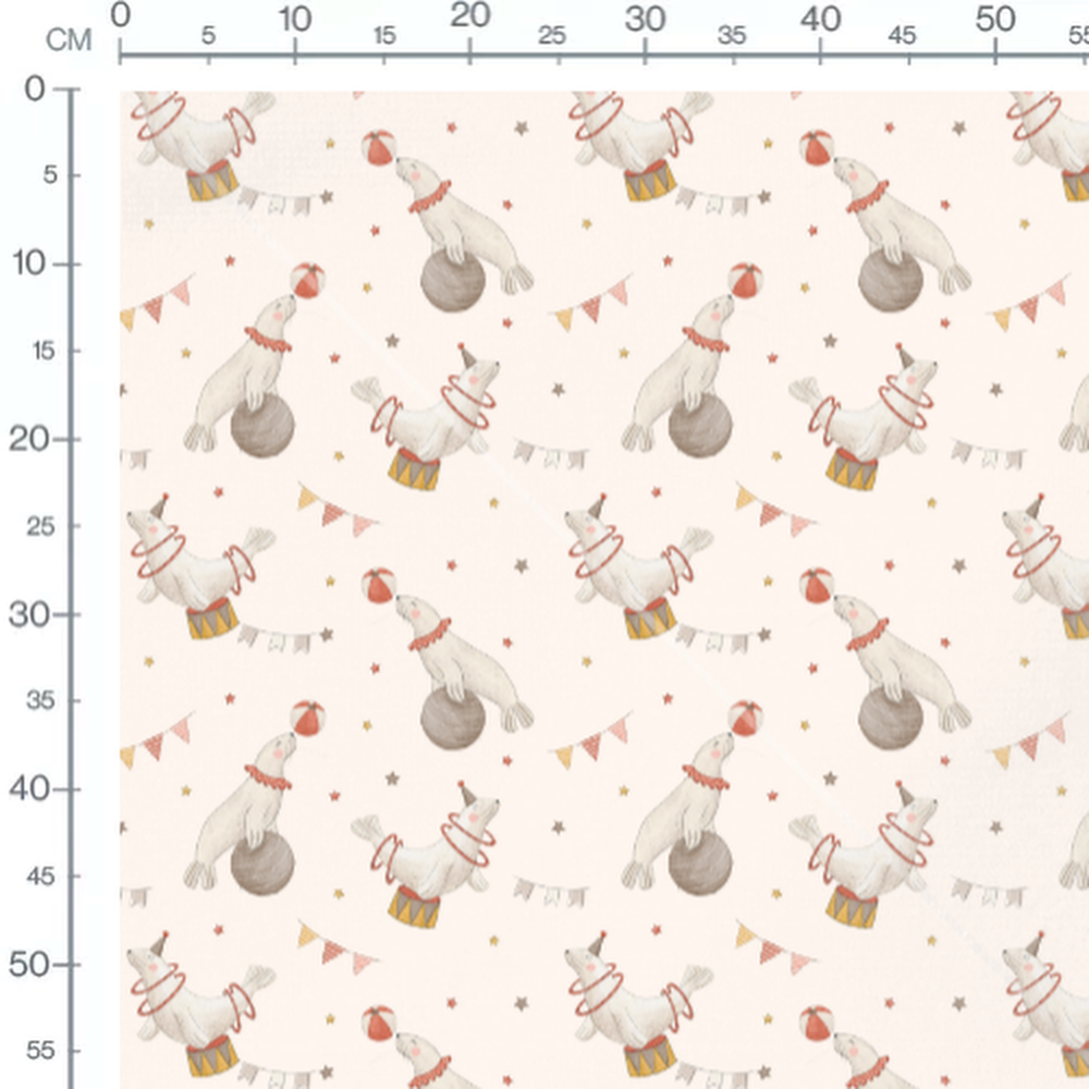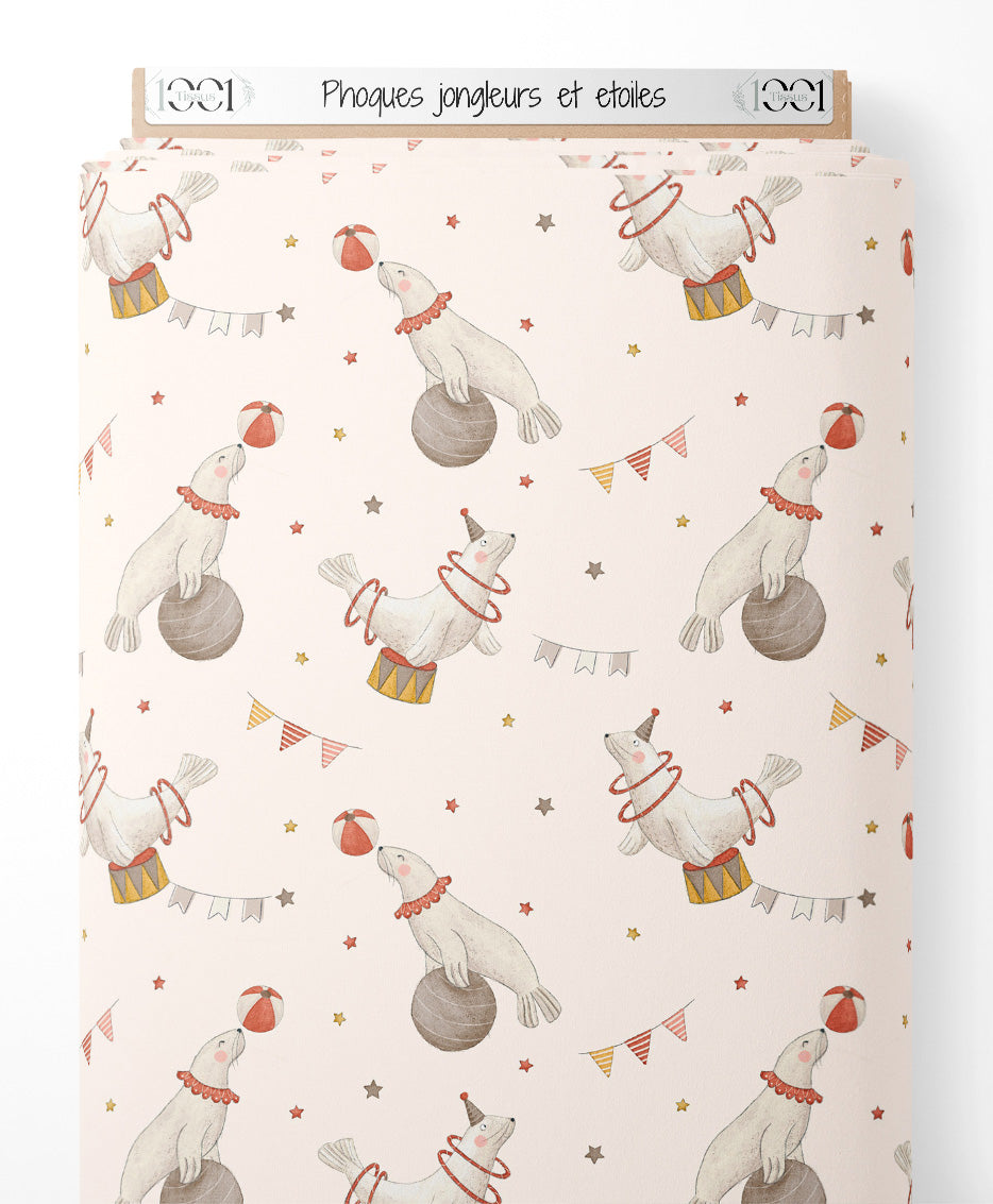Les phoques portent des collerettes rouges et jonglent avec des ballons rouges et blancs. Des étoiles jaunes et rouges parsèment le fond beige. Des fanions rayés ajoutent une touche festive au motif.Les tissus