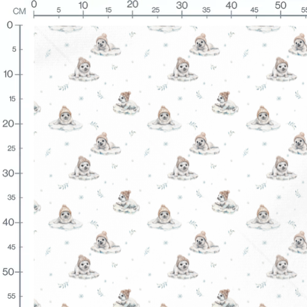 Les bébés phoques portent des bonnets marron et sont posés sur des morceaux de glace. De petites feuilles vertes et des flocons de neige bleus parsèment le fond blanc. Quelques points gris ajoutent de la texture au motif.Les tissus