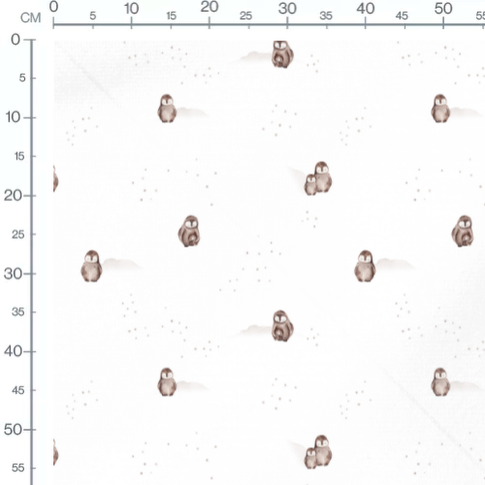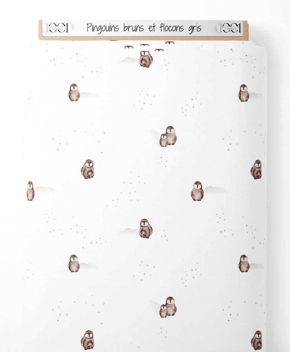 Les pingouins sont dessinés avec des nuances de brun et de blanc. Le fond blanc est parsemé de petits flocons gris, ajoutant une touche hivernale.Les tissus