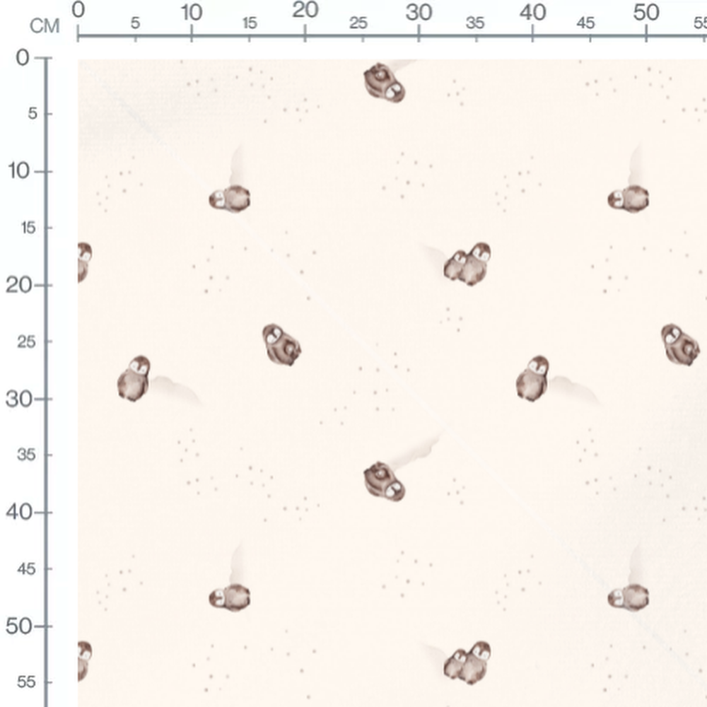 Les pingouins sont dessinés dans des tons bruns doux. Le fond blanc est parsemé de petits points gris, ajoutant une touche de texture subtile.Les tissus