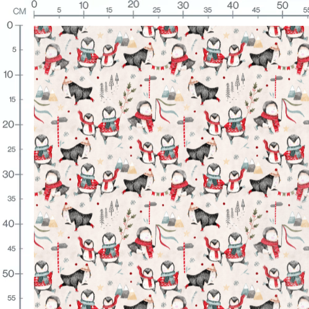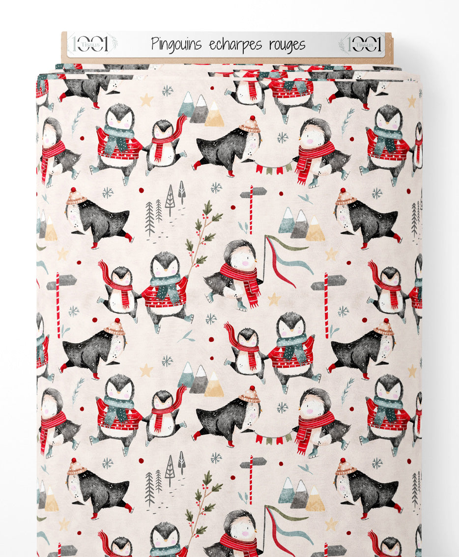 Les pingouins portent des écharpes rouges et des bonnets. Des montagnes enneigées et des arbres sont dispersés sur le fond. Des étoiles et des points rouges ajoutent des détails festifs.Les tissus