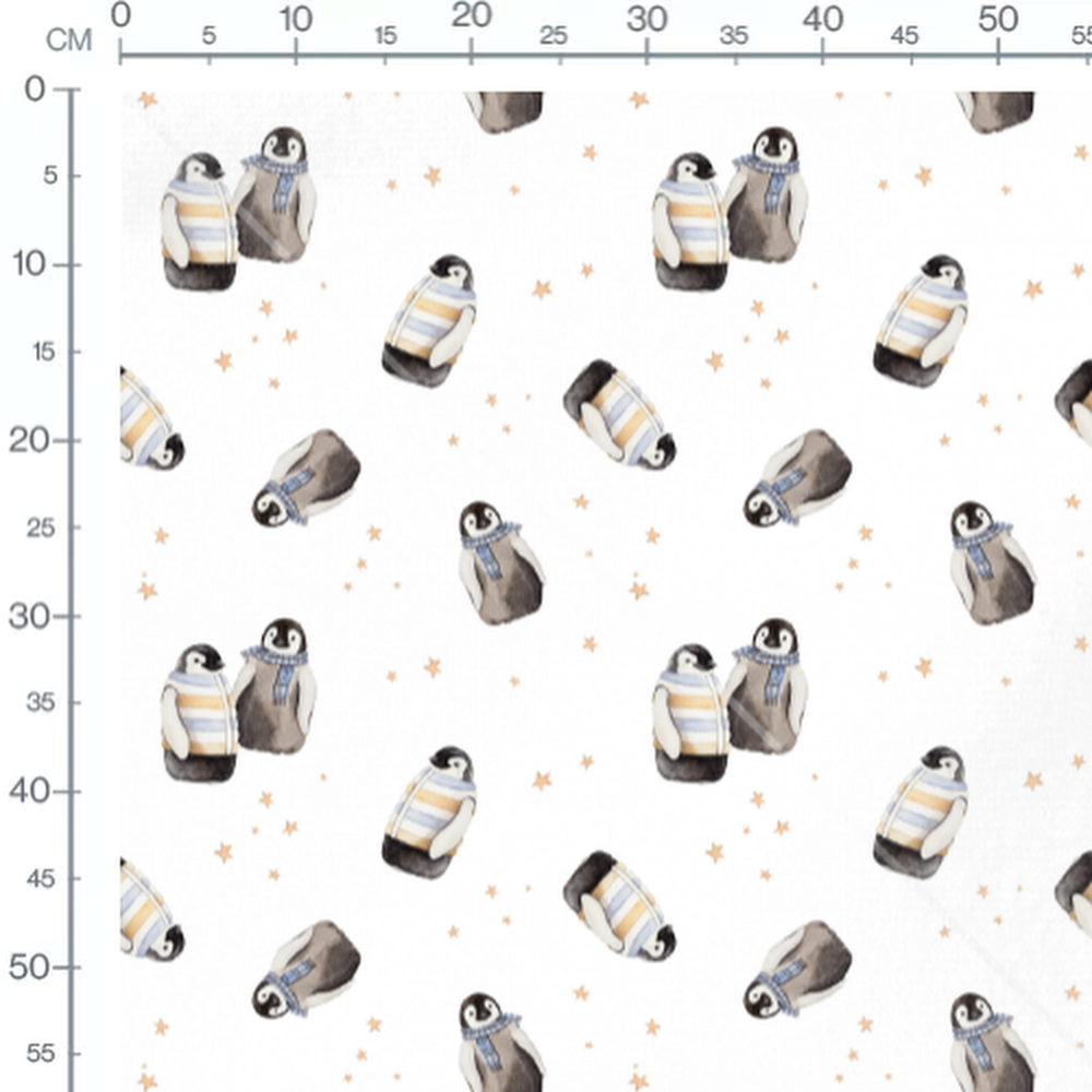 Les pingouins portent des écharpes bleues et des pulls rayés. Les étoiles sont de couleur orange clair.Les tissus