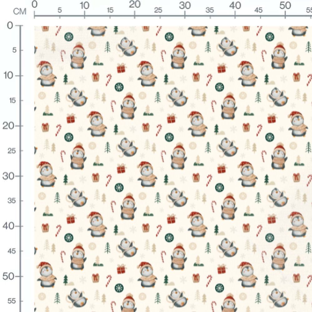 Petits sapins verts et flocons de neige blancs complètent le motif. Les pingouins portent des accessoires d'hiver rouges et beiges. Les cannes à sucre sont rouges et blanches, ajoutant une touche festive.Les tissus