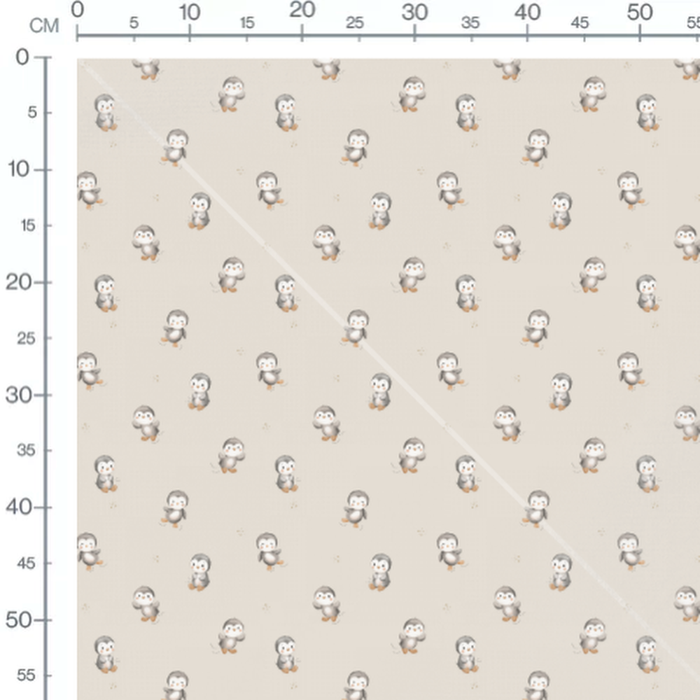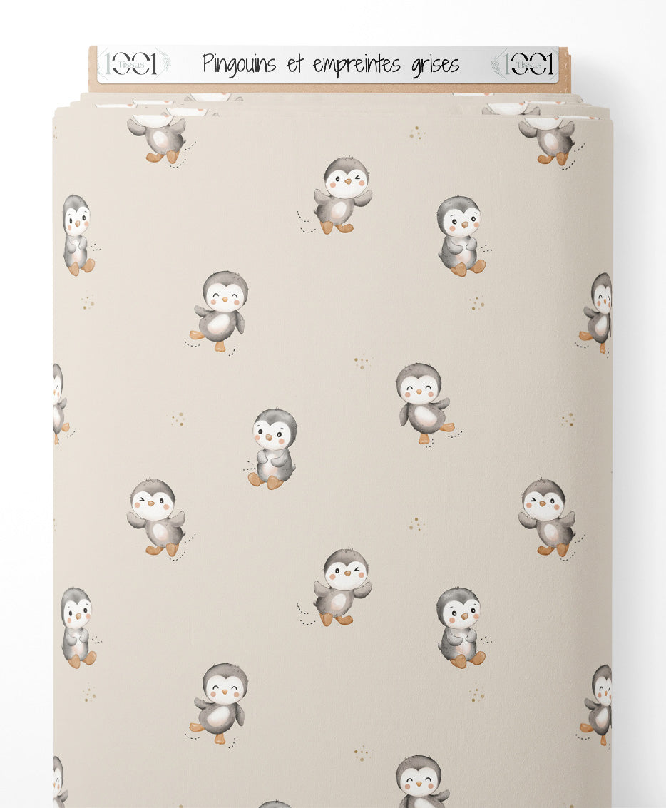 Les pingouins sont dessinés dans des positions variées. Le fond beige est parsemé de petites empreintes grises.Les tissus