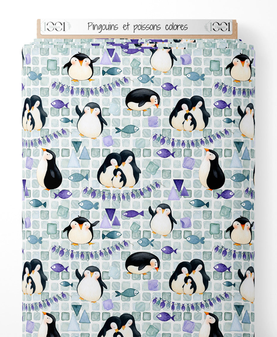 Les pingouins sont entourés de petits poissons colorés. Le fond est composé de formes géométriques dans des tons pastel. Des triangles et carrés ajoutent une touche de couleur au motif.Les tissus