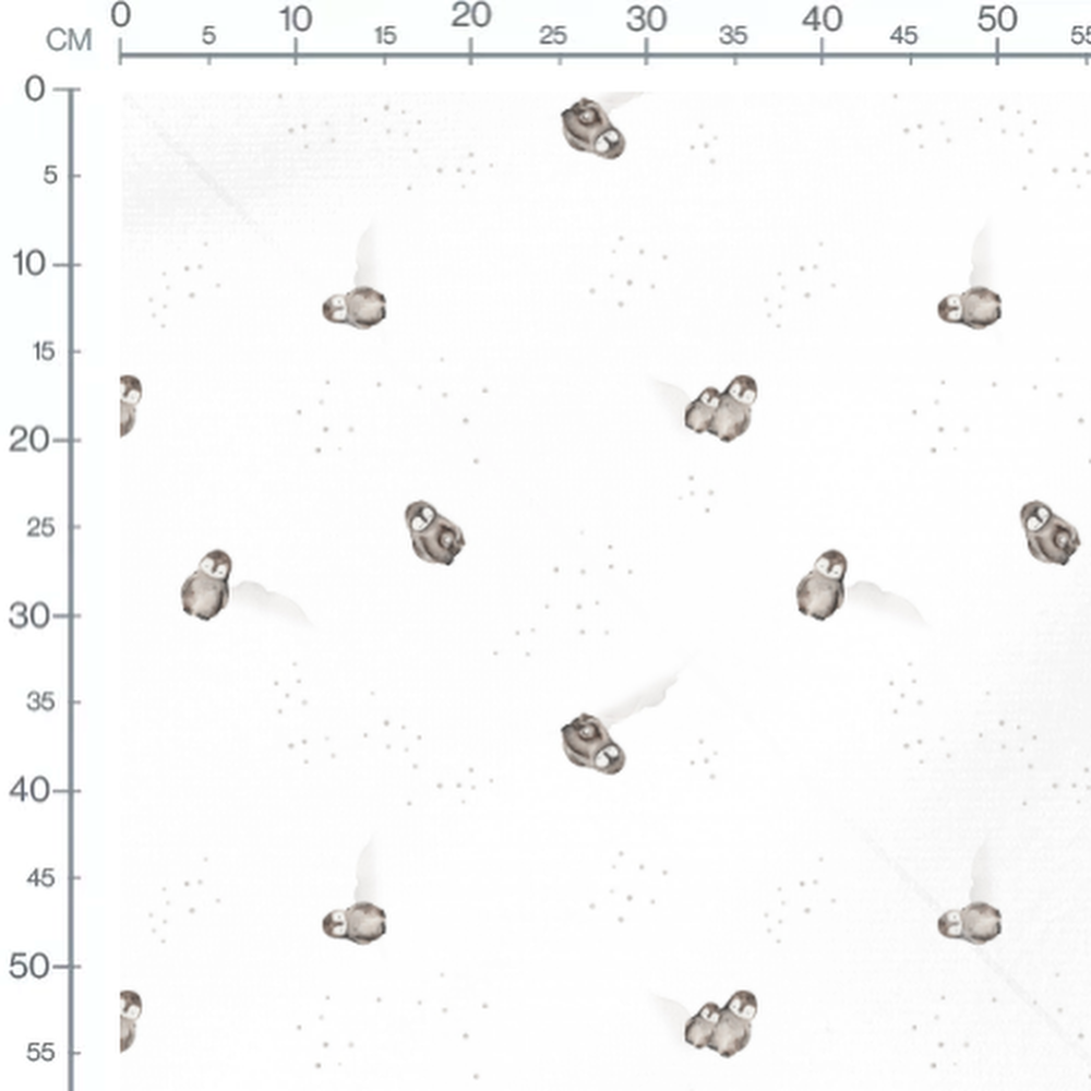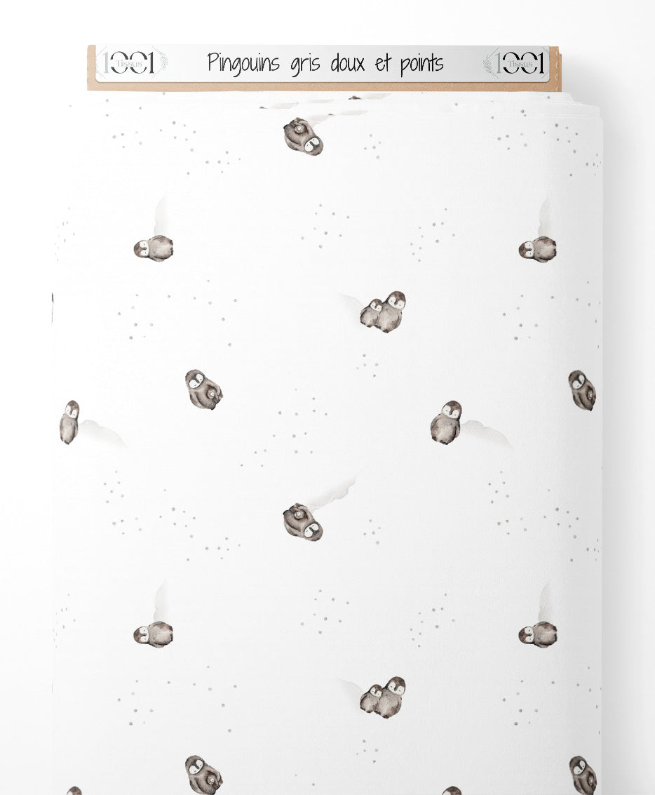 Les pingouins sont dessinés dans des tons de gris doux. Le fond blanc est parsemé de petits points gris, ajoutant une texture subtile.Les tissus