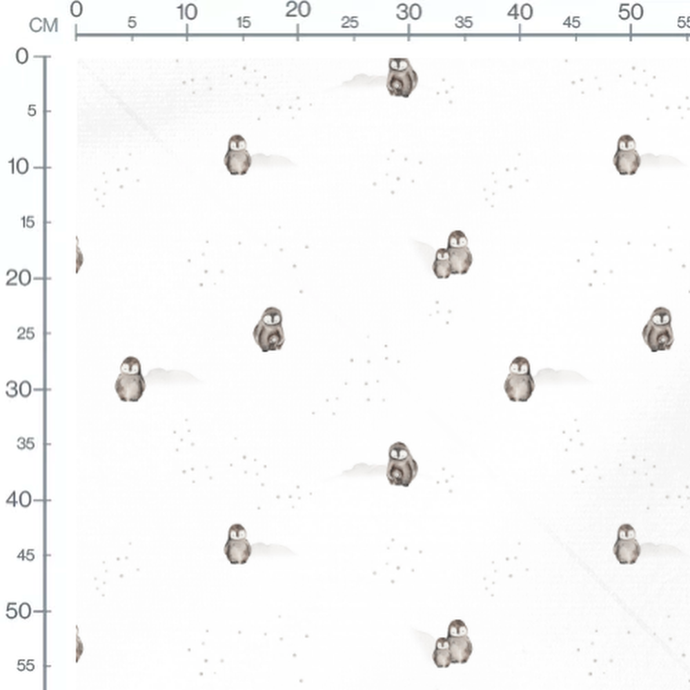 Les pingouins sont dessinés avec des nuances de gris et de blanc. Le fond blanc est parsemé de petits points gris, ajoutant une texture subtile. Les pingouins sont représentés dans différentes positions, apportant une touche ludique au motif.Les tissus