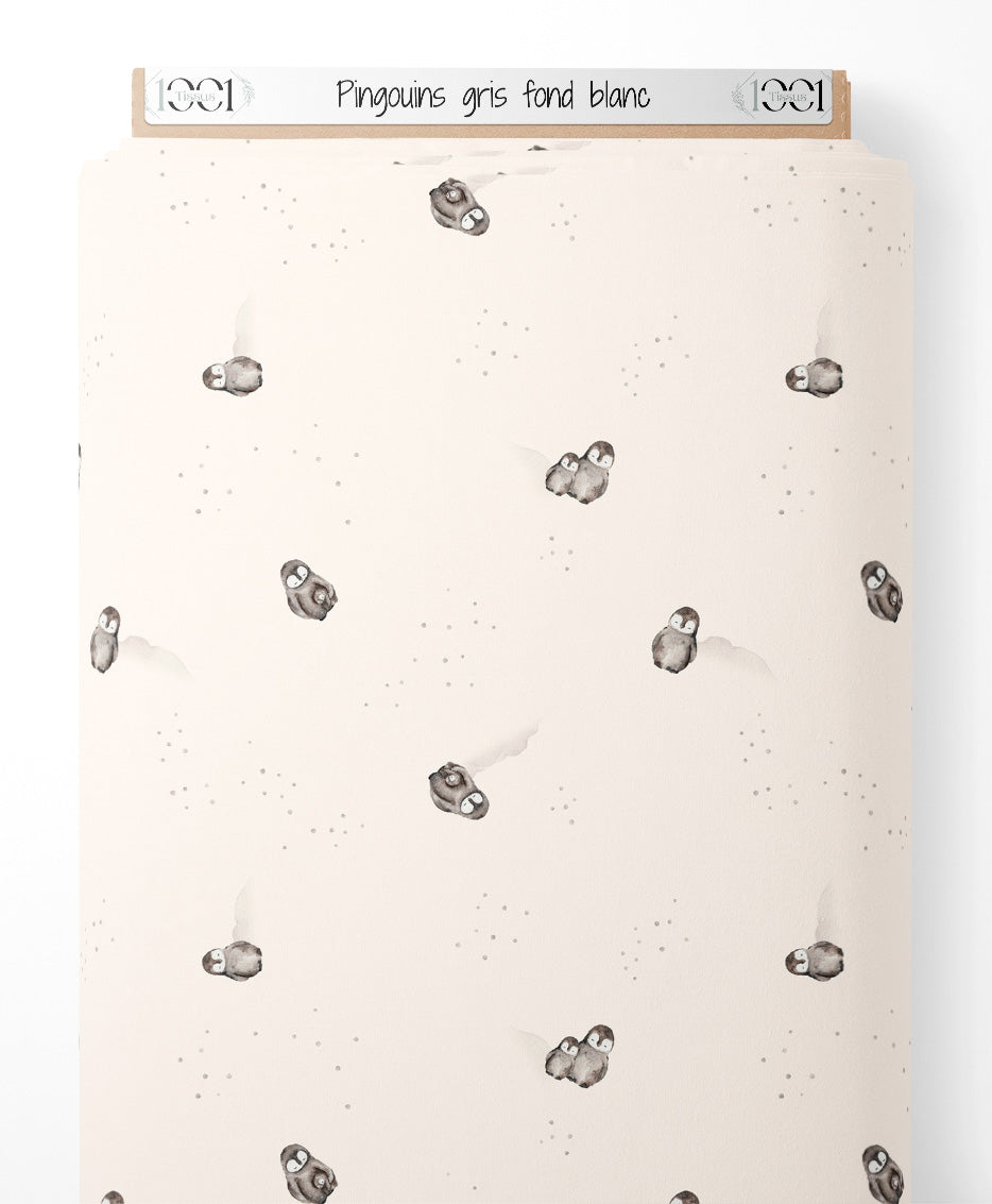 Les pingouins sont dessinés dans des tons de gris doux. Le fond blanc est parsemé de petits points gris, ajoutant une texture subtile.Les tissus