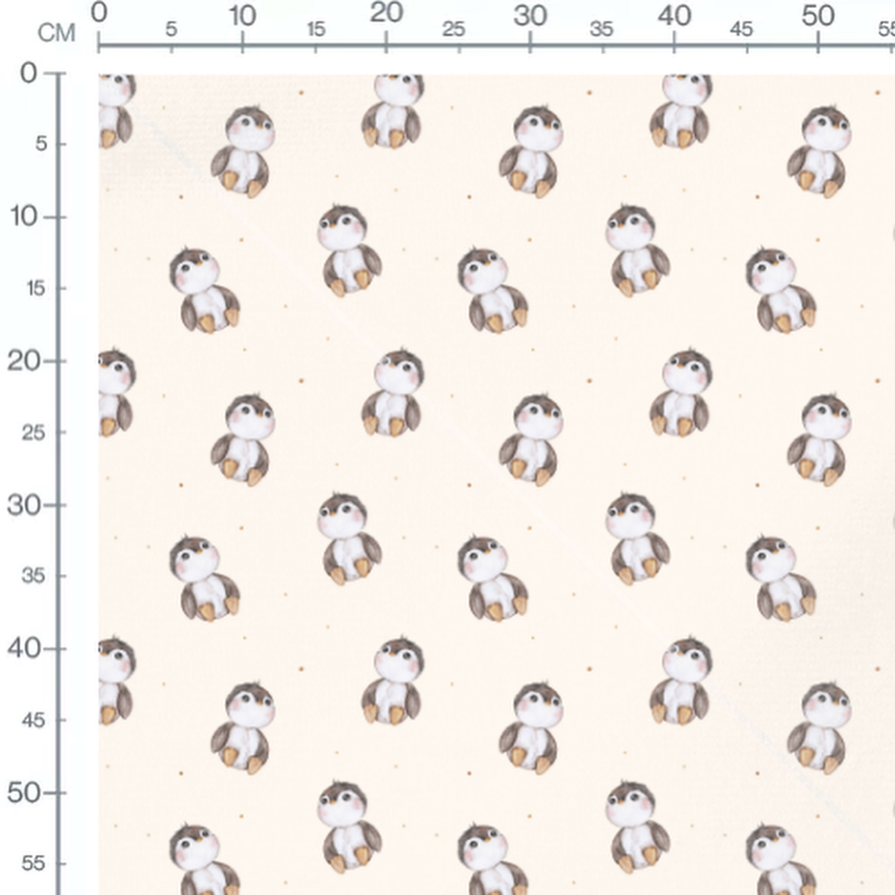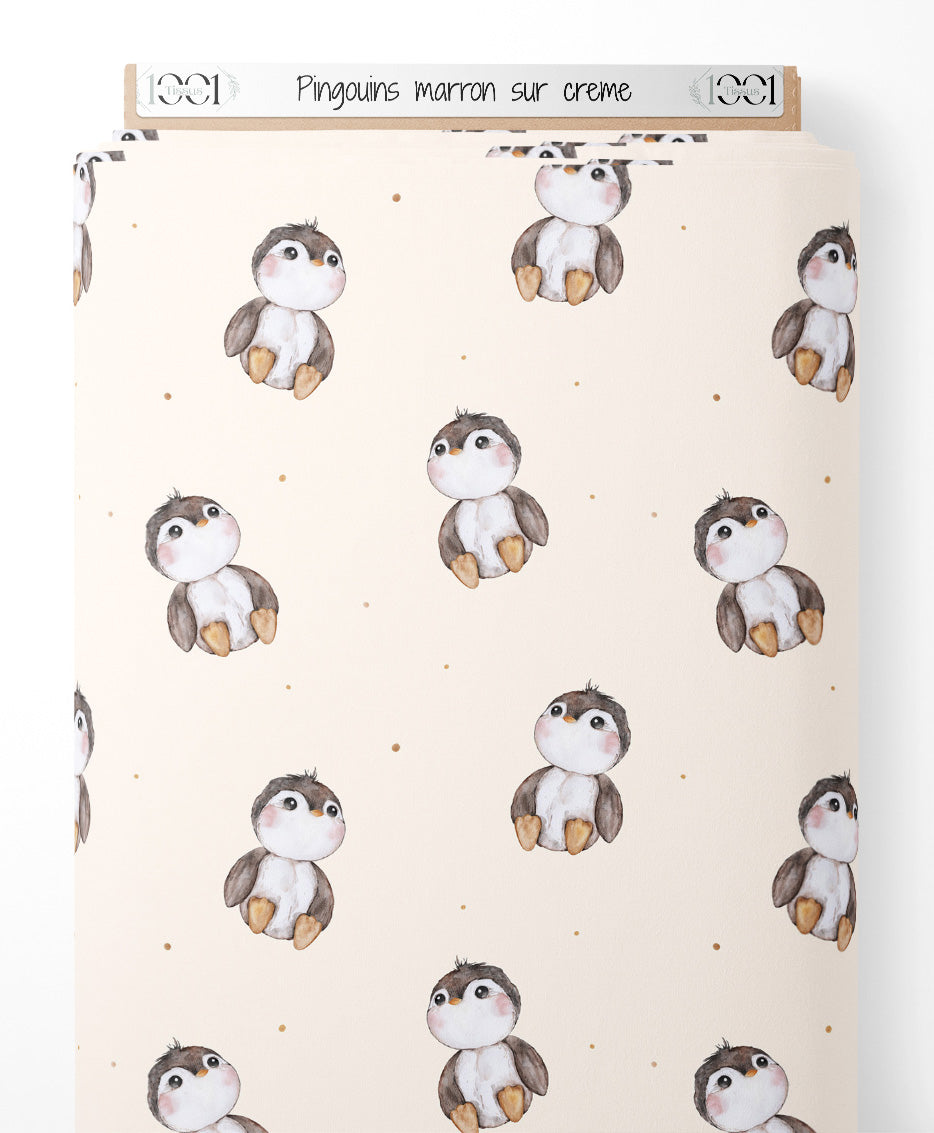 Les pingouins ont des joues roses et des ailes marron. Le fond crème est parsemé de petits points beige.Les tissus