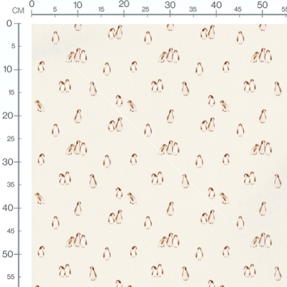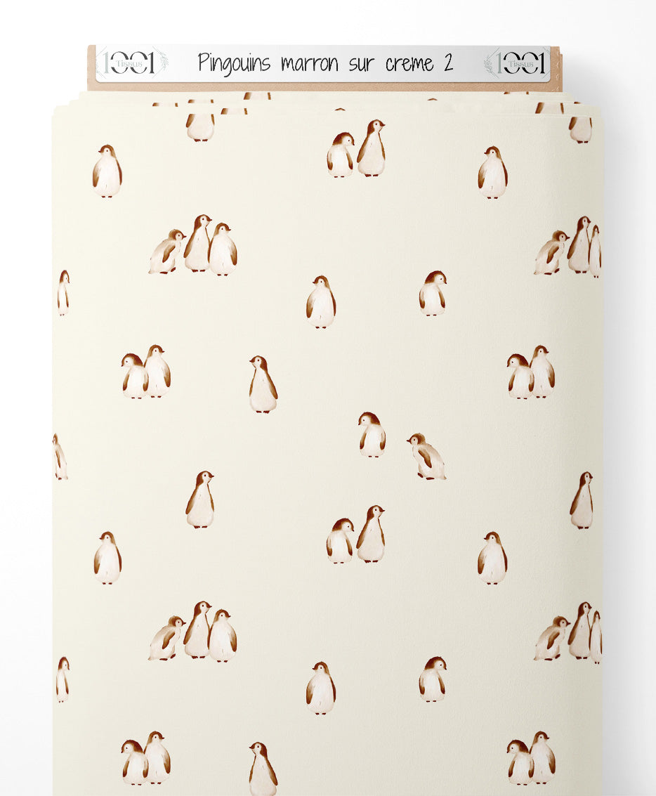 Les pingouins sont dessinés avec des nuances de marron et de blanc. Ils sont représentés seuls ou en petits groupes sur un fond crème uni.Les tissus