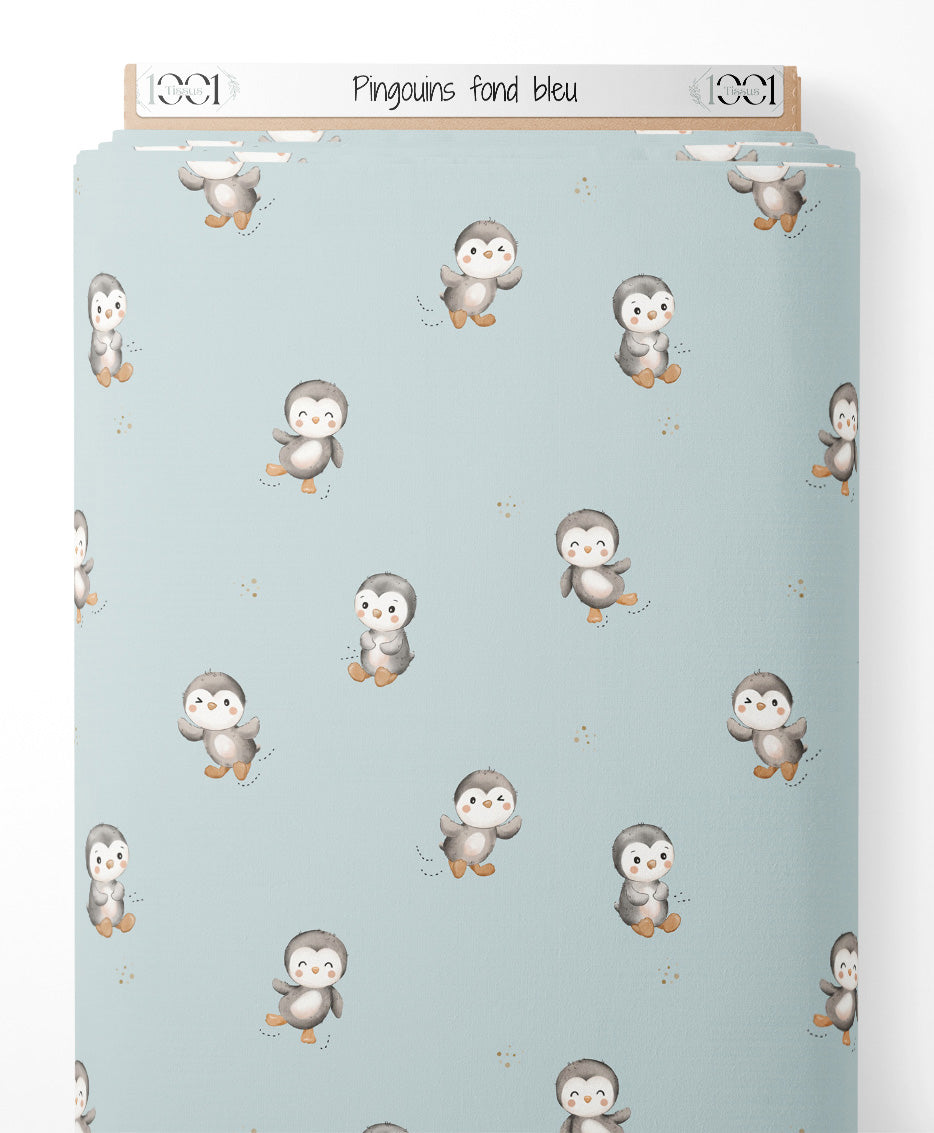 Tissu - Pingouins sur fond bleu