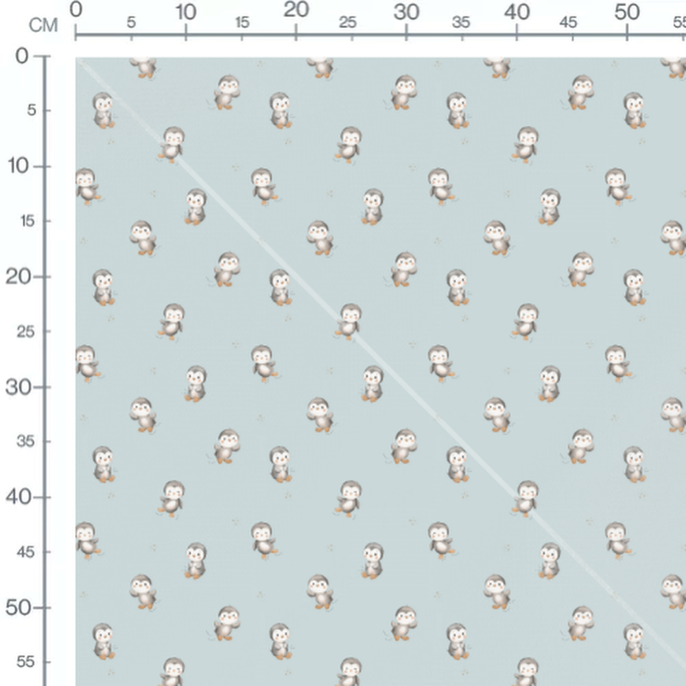 Les pingouins ont des expressions joyeuses et sont dispersés sur le fond. Le bleu clair du fond met en valeur les couleurs douces des pingouins. Les petites traces de pas ajoutent un détail ludique au motif.Les tissus