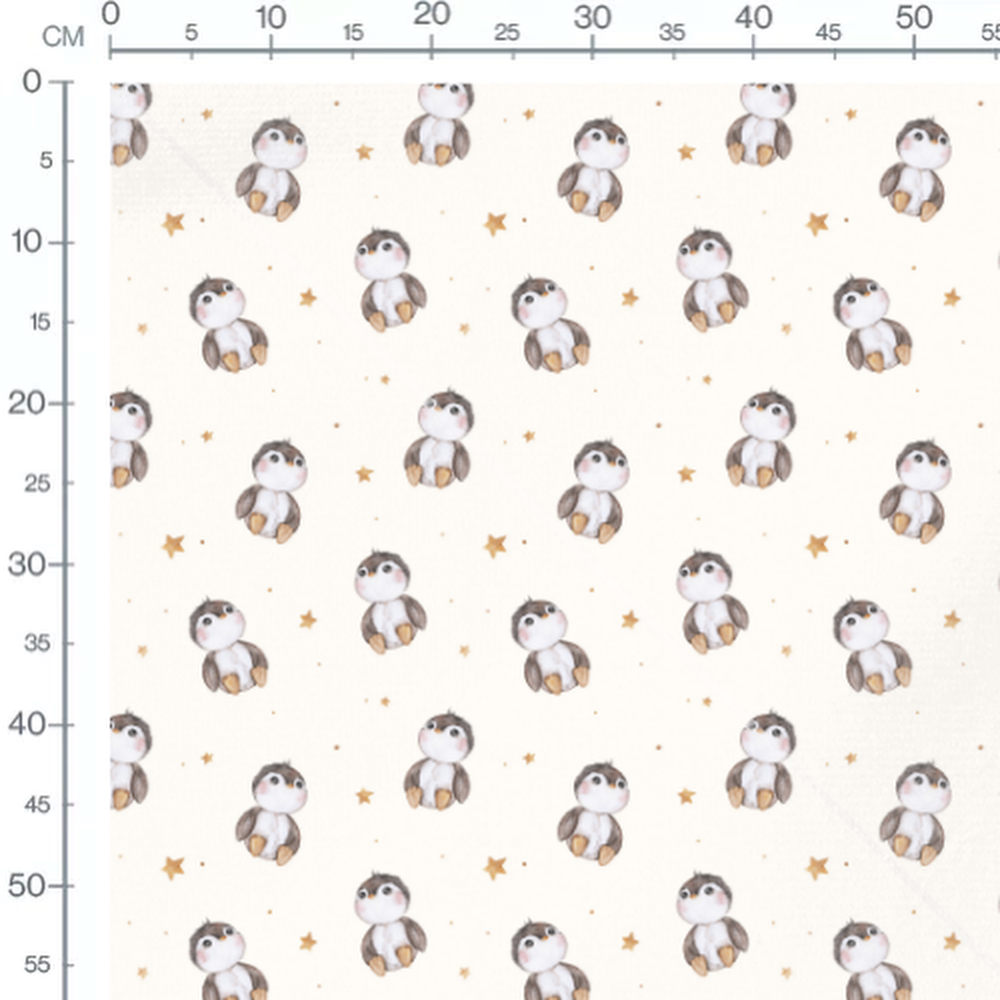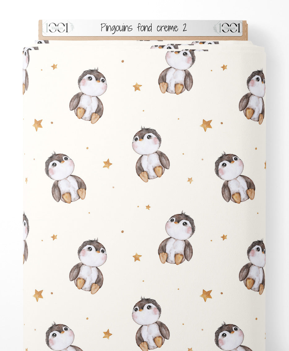 Les pingouins ont des joues roses et des ailes brunes. Les étoiles dorées ajoutent une touche lumineuse au motif. Le fond crème crée une ambiance douce et apaisante.Les tissus