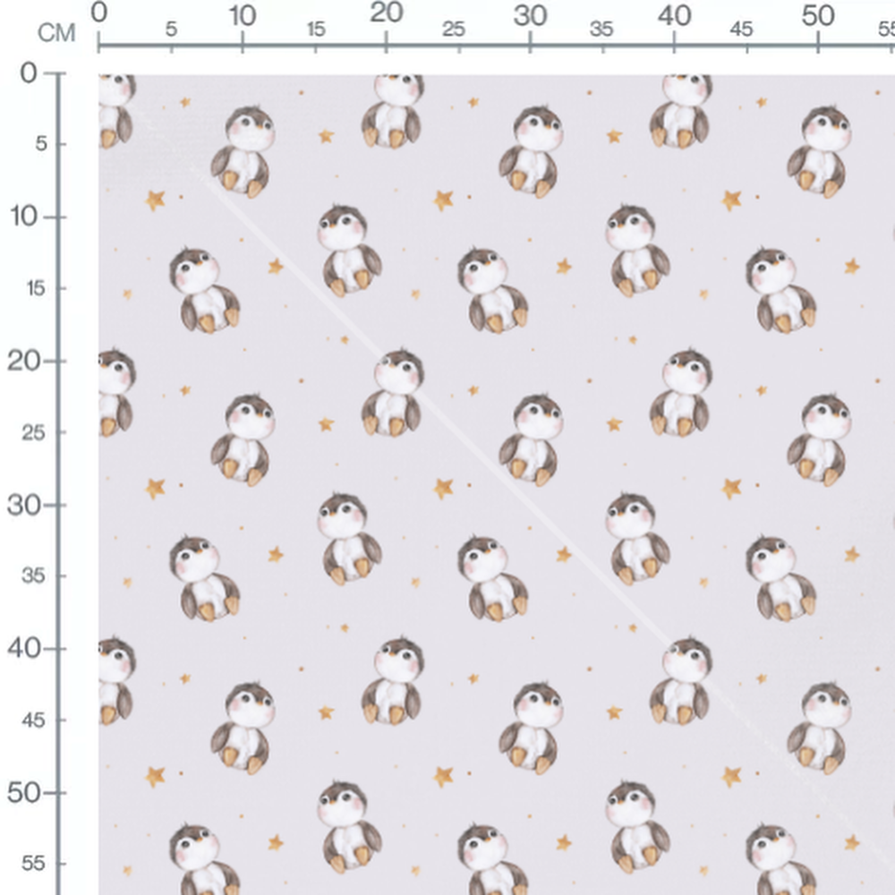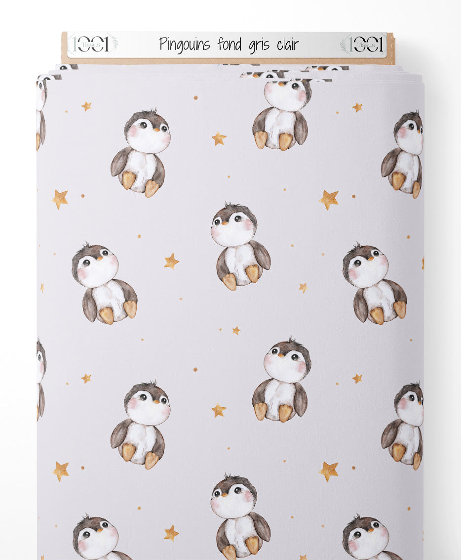 Les pingouins ont des joues rosées et des ailes marron. Les étoiles dorées ajoutent une touche lumineuse au motif. Le fond gris clair met en valeur les éléments du motif.Les tissus