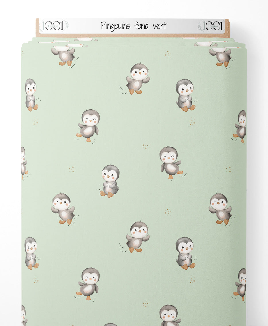Les pingouins ont des becs et des pattes orange. Le fond vert clair est parsemé de petites traces de pas grises.Les tissus